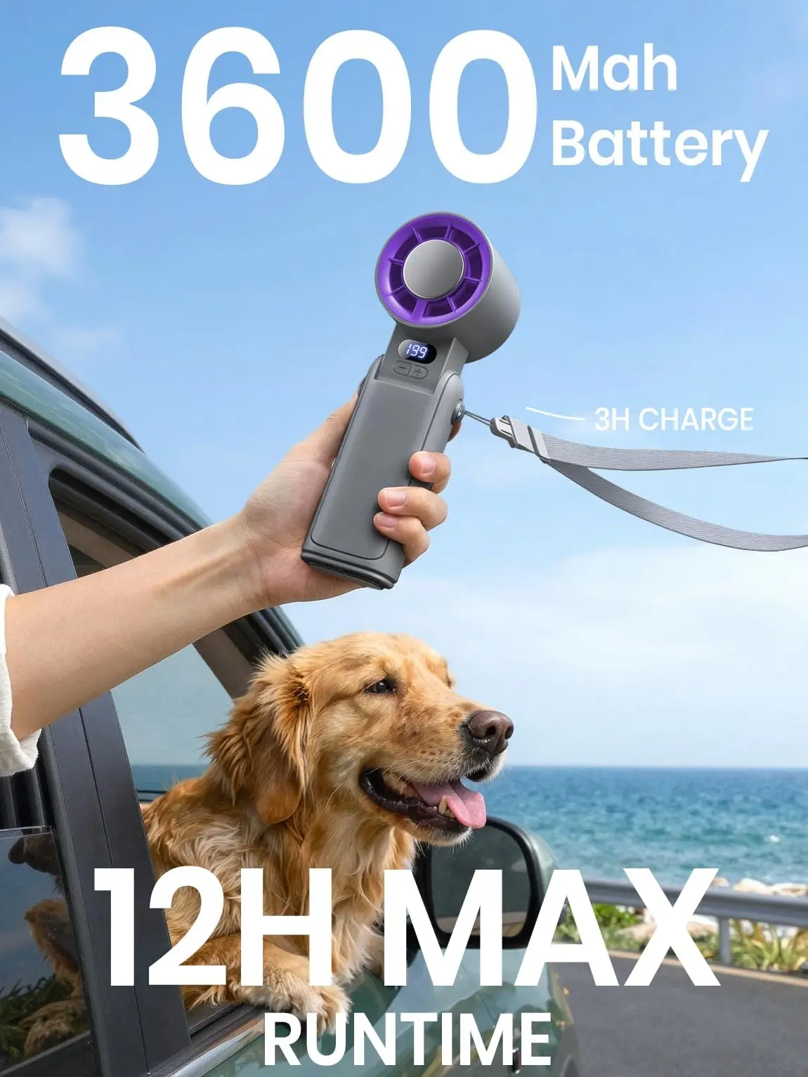 【Long Lasting & Fast Charging】Built-in 3600mAh rechargeable battery provides up to 12 hours of cooling. USB-C fast charging fully charges in about 3 hours. Built-in digital LED battery display shows the remaining power percentage in real time. Note: battery life varies by speed level.