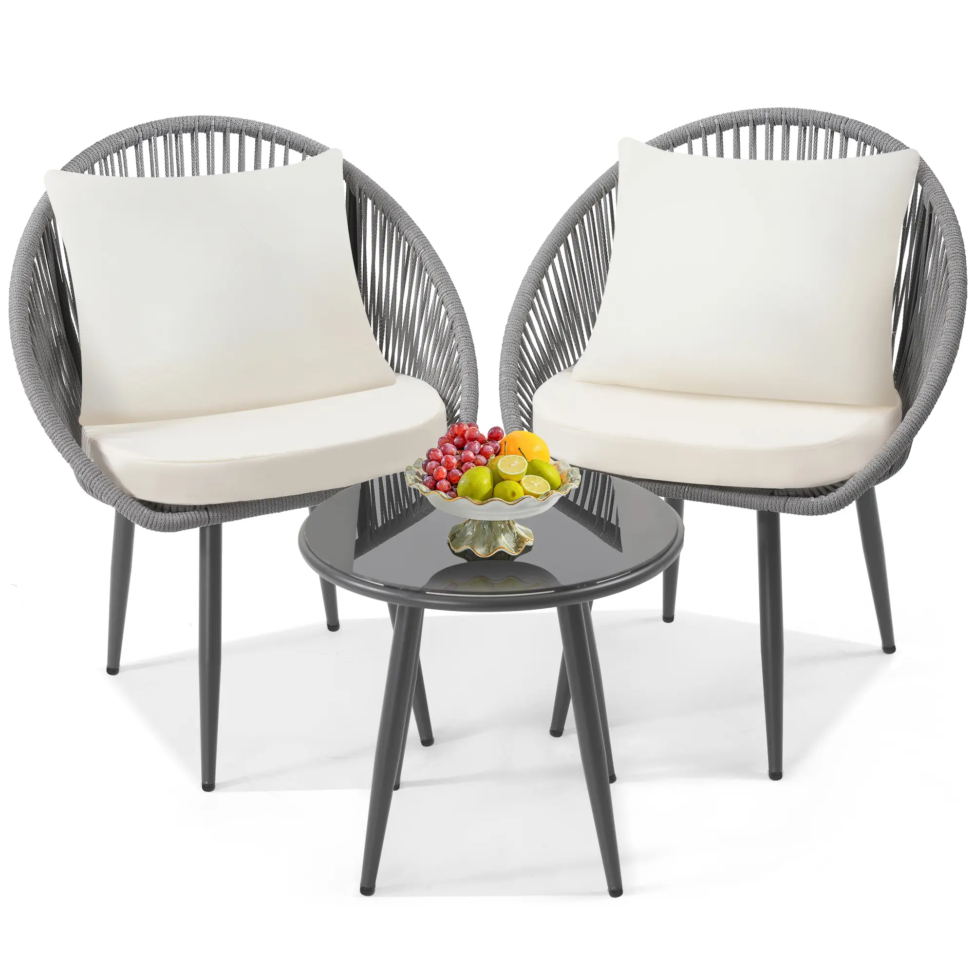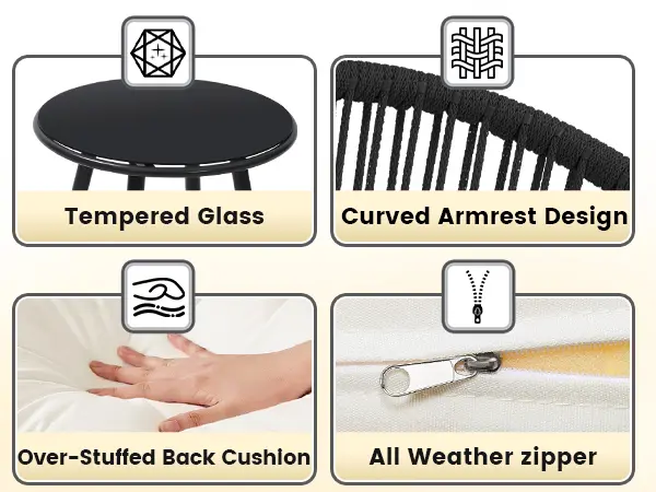 Upgrade your outdoor area with this weather-resistant 3-piece bistro set. It comes with comfortable cushioned woven rope chairs and a convenient side table, making it great for poolside, balcony, and backyard use. Designed to be multi-purpose, this set combines lasting comfort with modern style.