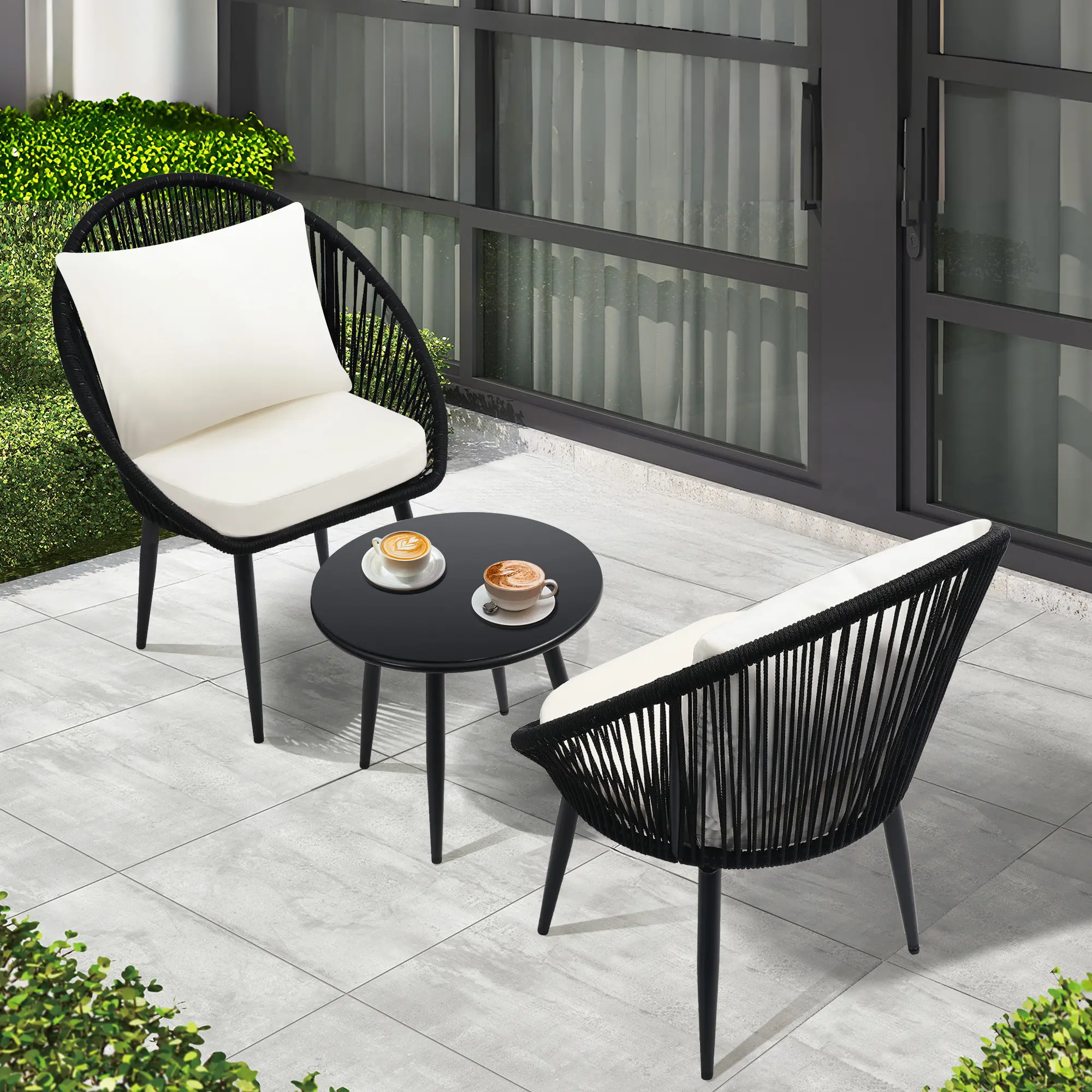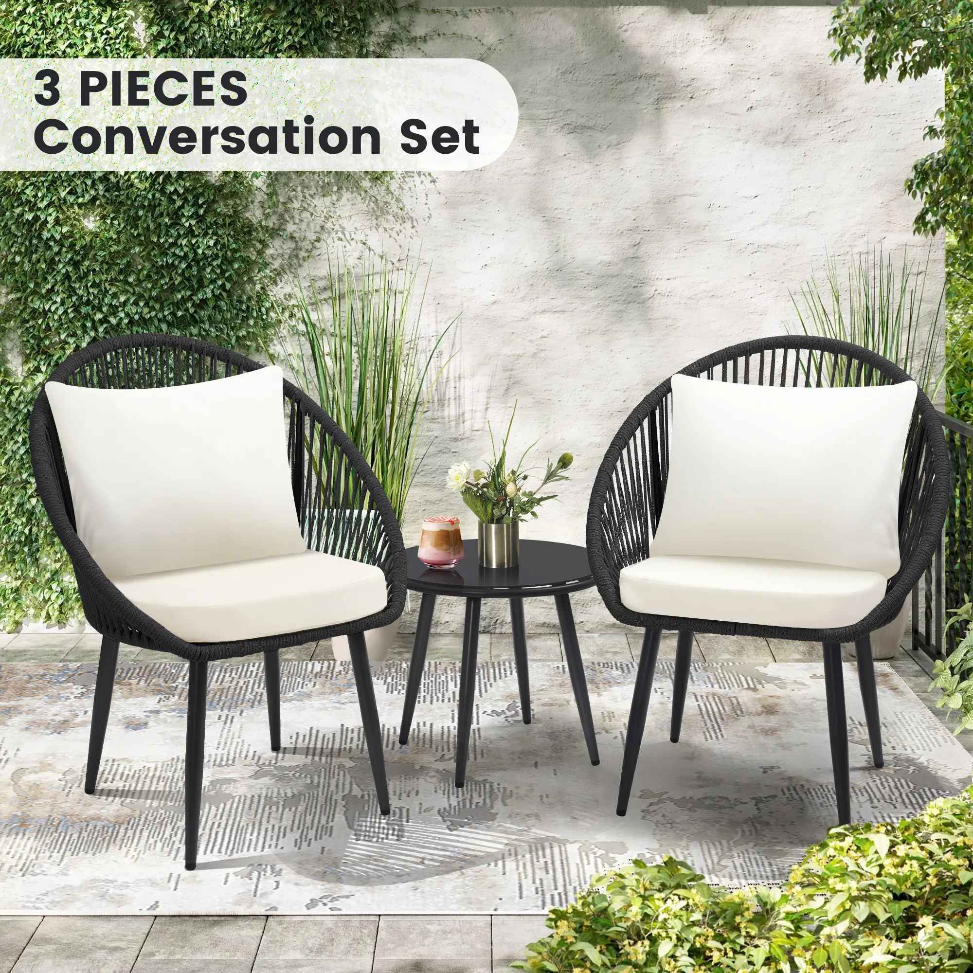 3-Piece All-Weather Outdoor Bistro Furniture Set – Comfortable Cushioned Rope Woven Chairs & Side Table, Great for Poolside, Balcony & Backyard, Black