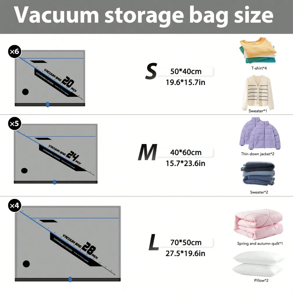 6 Pack Transparent Vacuum Compression Bags with Double Zipper Seal 2 Jumbo 2 Large 2 Medium Save Space for Bedding Pillows Blankets Travel Essentials Large Capacity Dust-proof Sealed Storage Bag Organiser