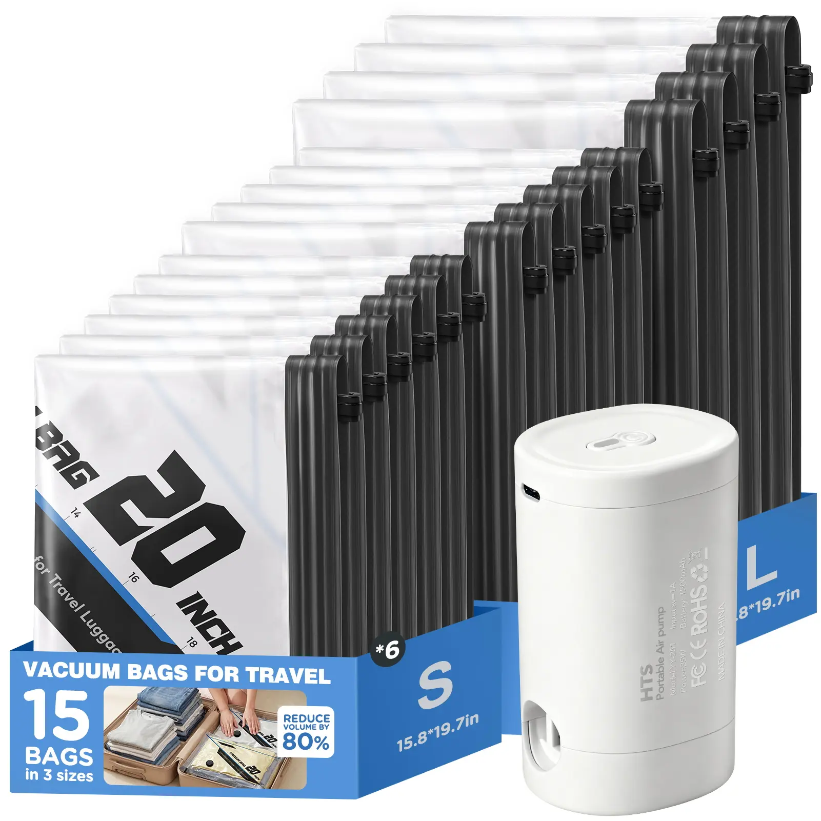 15 Pack Travel Vacuum Storage Bags with Wireless Rechargeable Pump,Reusable & Space Saver Compression Packing Bags for Clothes Bedding & Travel Luggage and Suitcase Organiser,Seasonal Storage