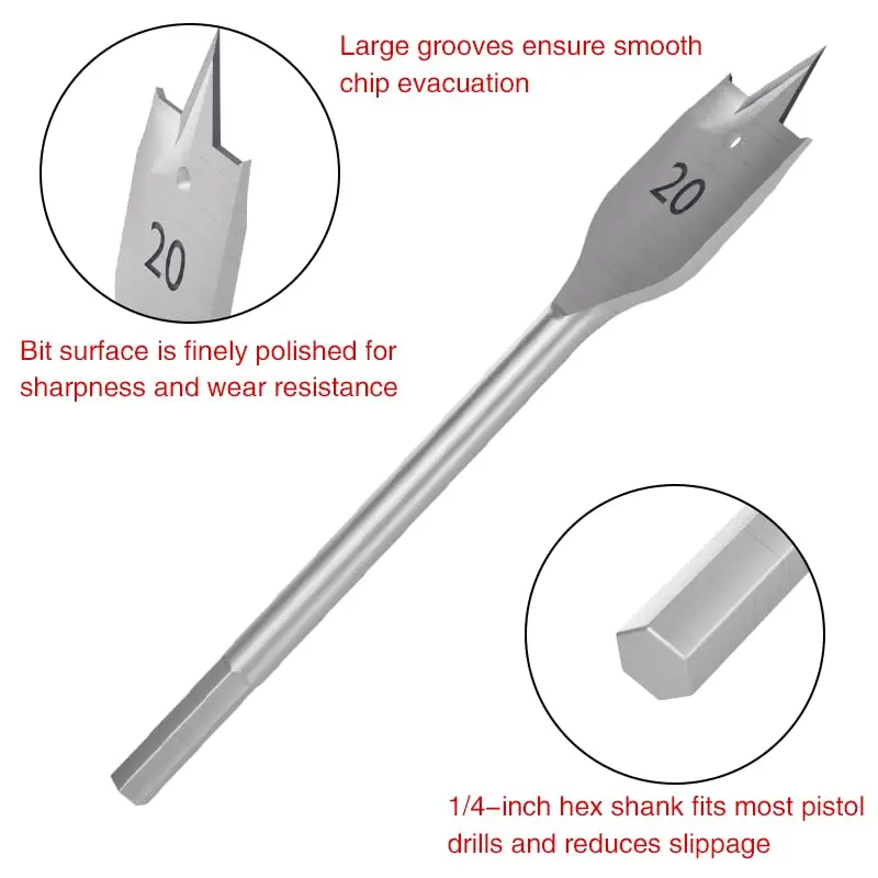 ·Self-centering spade head allows for precise starting and spade head evacuates material as it cuts. Perfect for hole openers.1/4" hex shank fits most drills and reduces slippage.