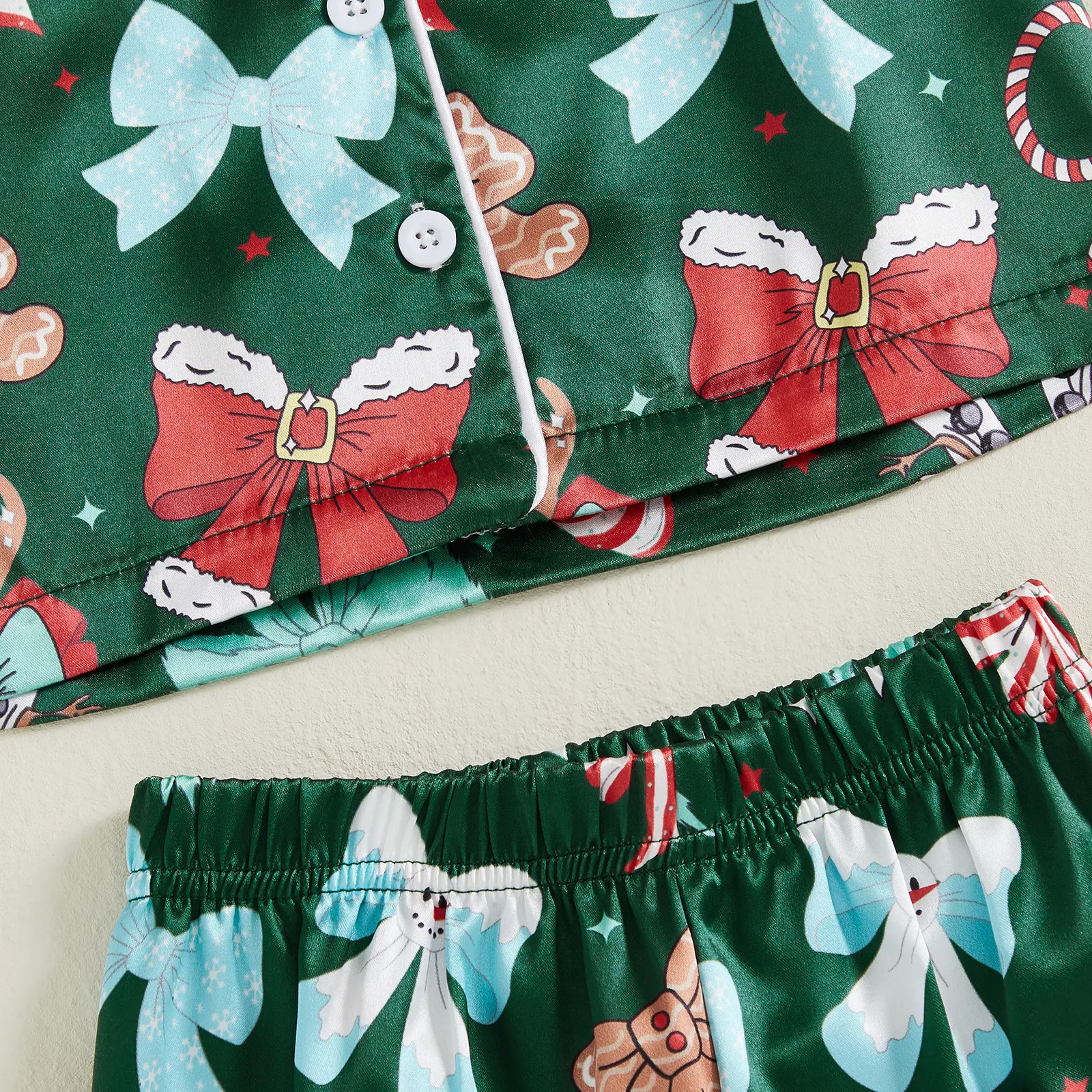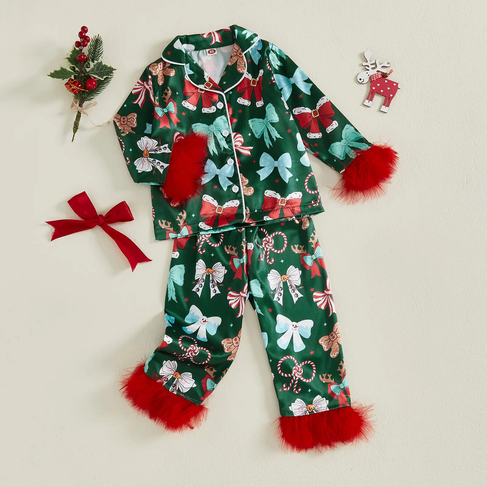 Girls 2Pcs Christmas Pajamas Long Sleeve Bow Print Button Shirt + Pants Set Toddler Loungewear