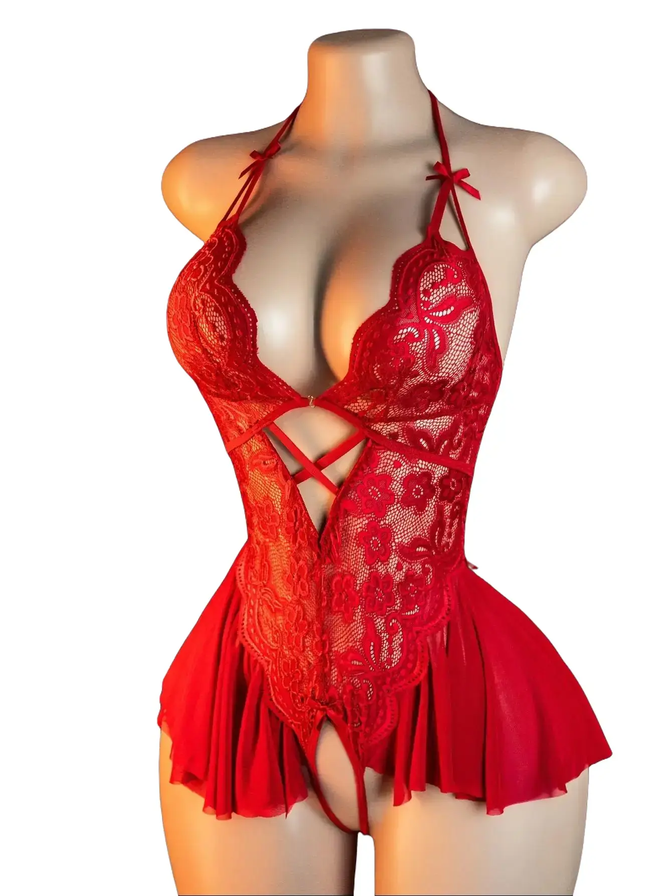 Red lace bodysuit with contrasting cutout neckline, sexy backless design, women's style, provides full body coverage, no chest padding.This adjustable jumpsuit is made of hand-washable stretch fabric.