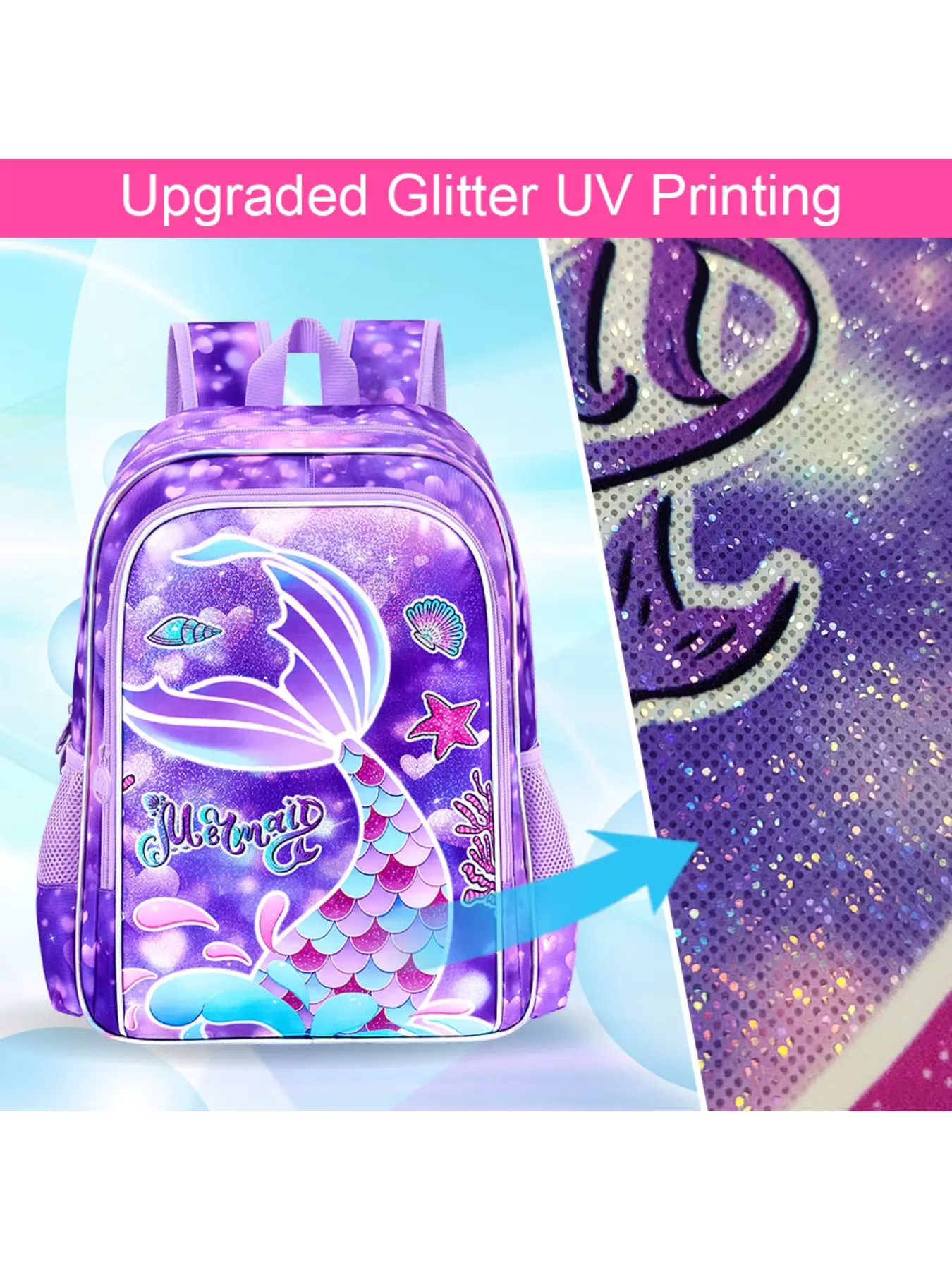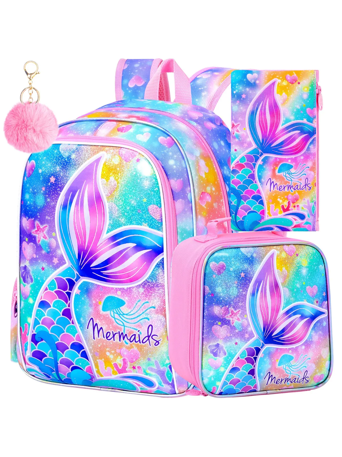 3Pcs Mermaid Backpack for Girls, 16" Kids Fishtail Bookbag with Lunch Box, Cute Schoolbag for Preschool Kindergarten Toddler(Rainbow)