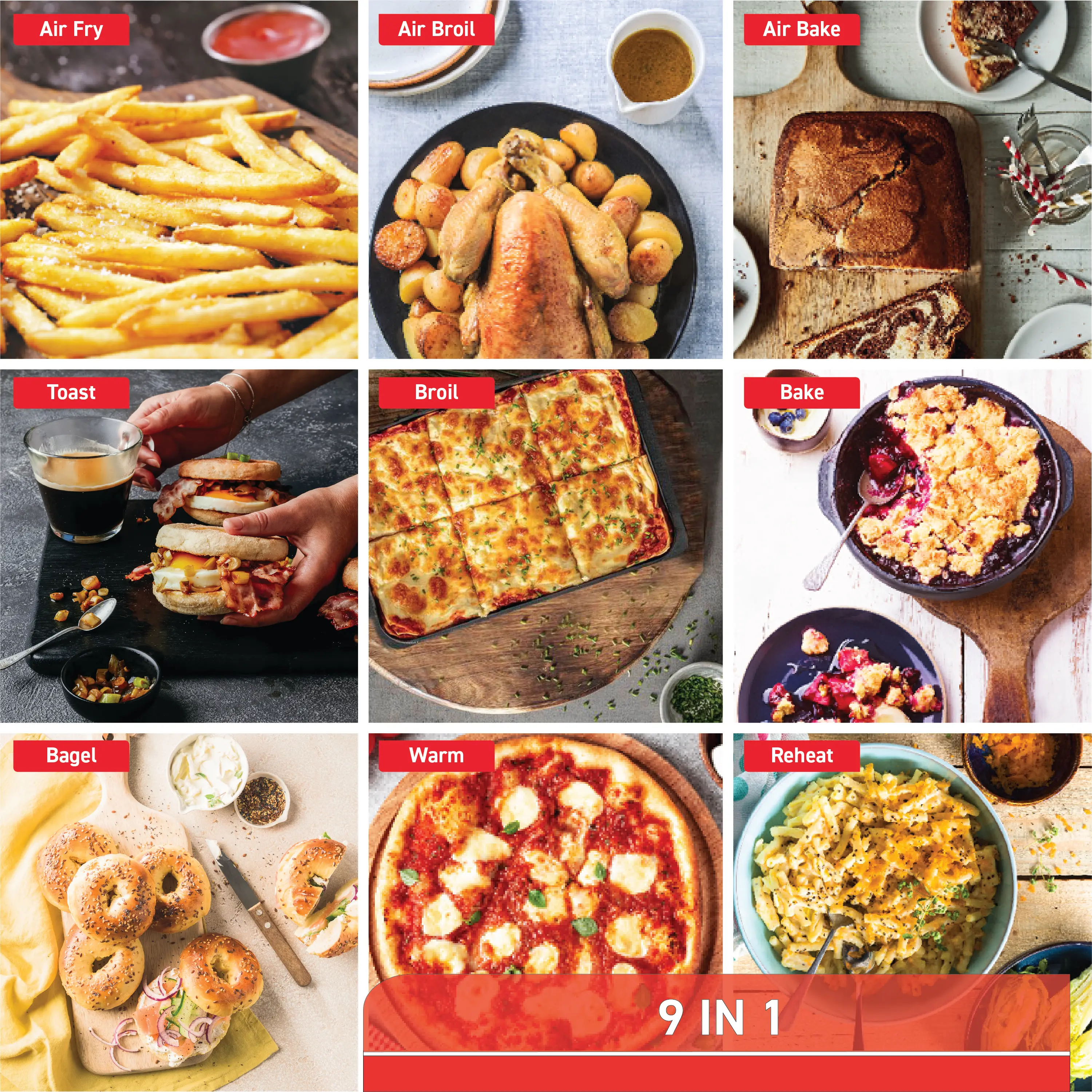 Includes 9 cooking functions: Air Fry, Air Broil, Air Bake, Broil, Bake, Toast, Warm, Reheat, and Bagel.