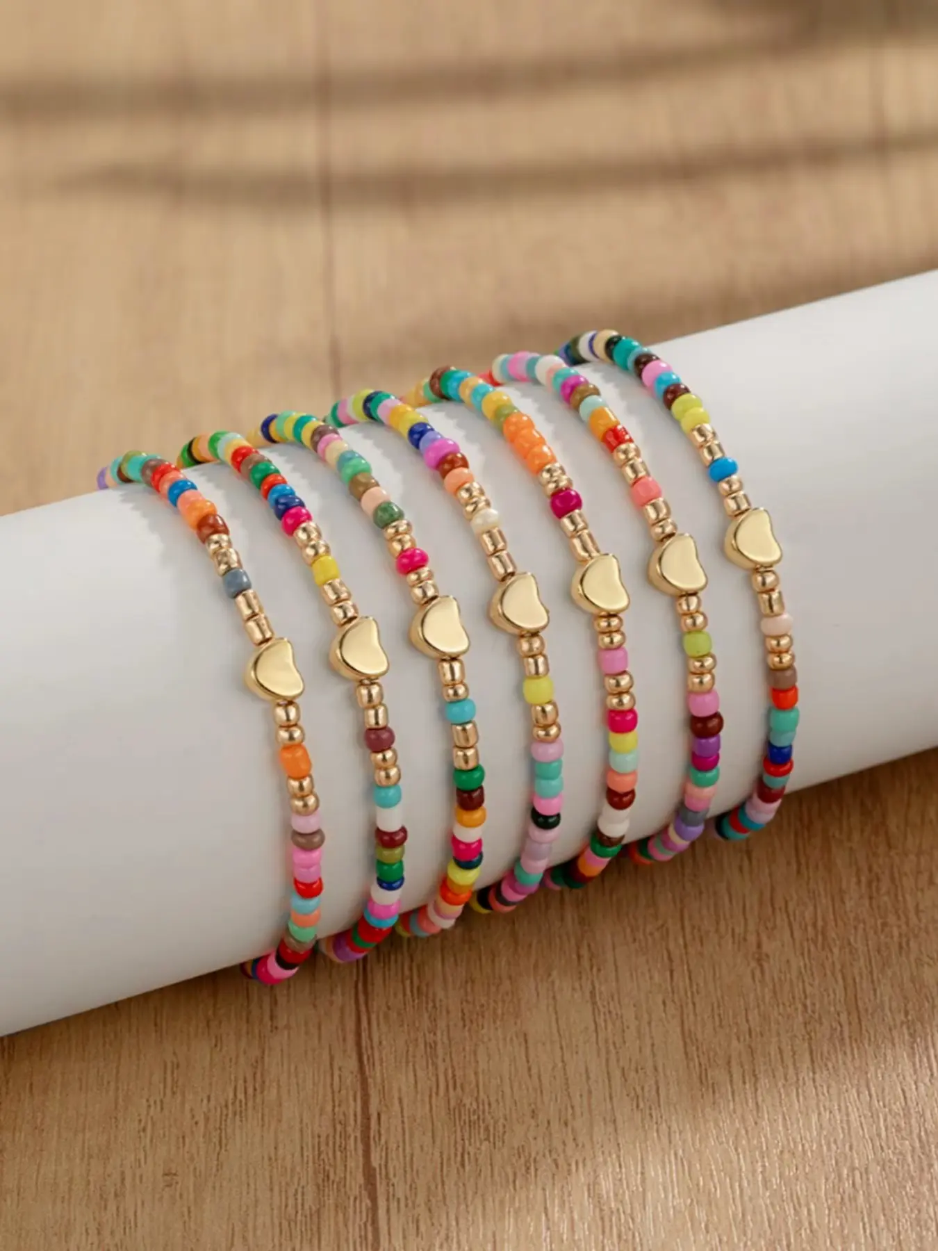 Colorful Rainbow Beaded Bracelet Set with Gold Heart Charm | Y2K Aesthetic Stackable Bracelets for Women | Summer Beach Friendship Jewelry Gift