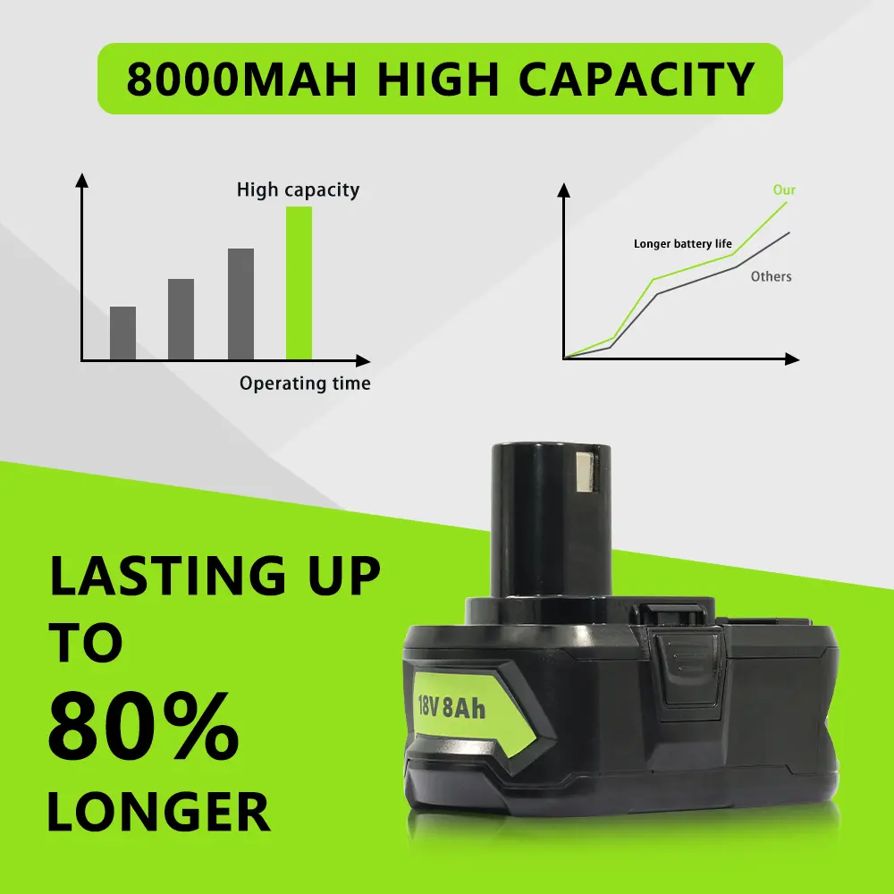 ·2/4-Pack 18V 8.0Ah High-Capacity Lithium-Ion Battery for Ryobi ONE+. This battery is designed to power your Ryobi ONE+ tools efficiently. Compatible with P108 and P109 models, it ensures reliable performance.