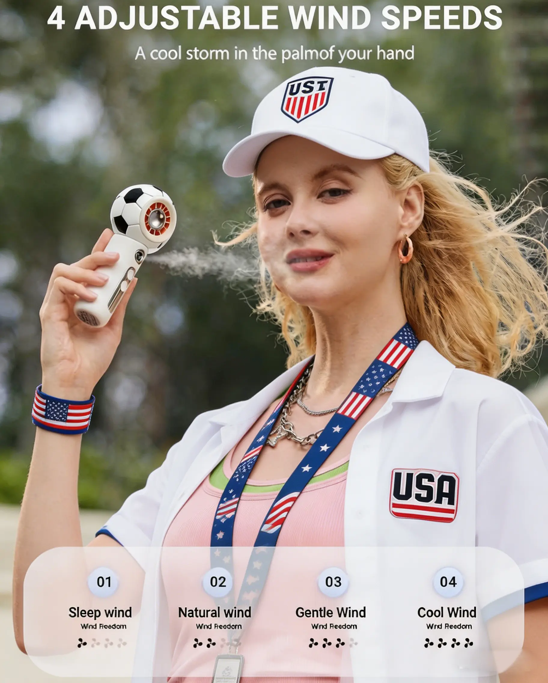 ·4 Adjustable Speeds: This water spray fan offers 4 speeds, from a gentle breeze to turbo wind. Easily find your ideal airflow. Its dual-button design allows independent control of fan speed and mister. Hold speed button to turn off