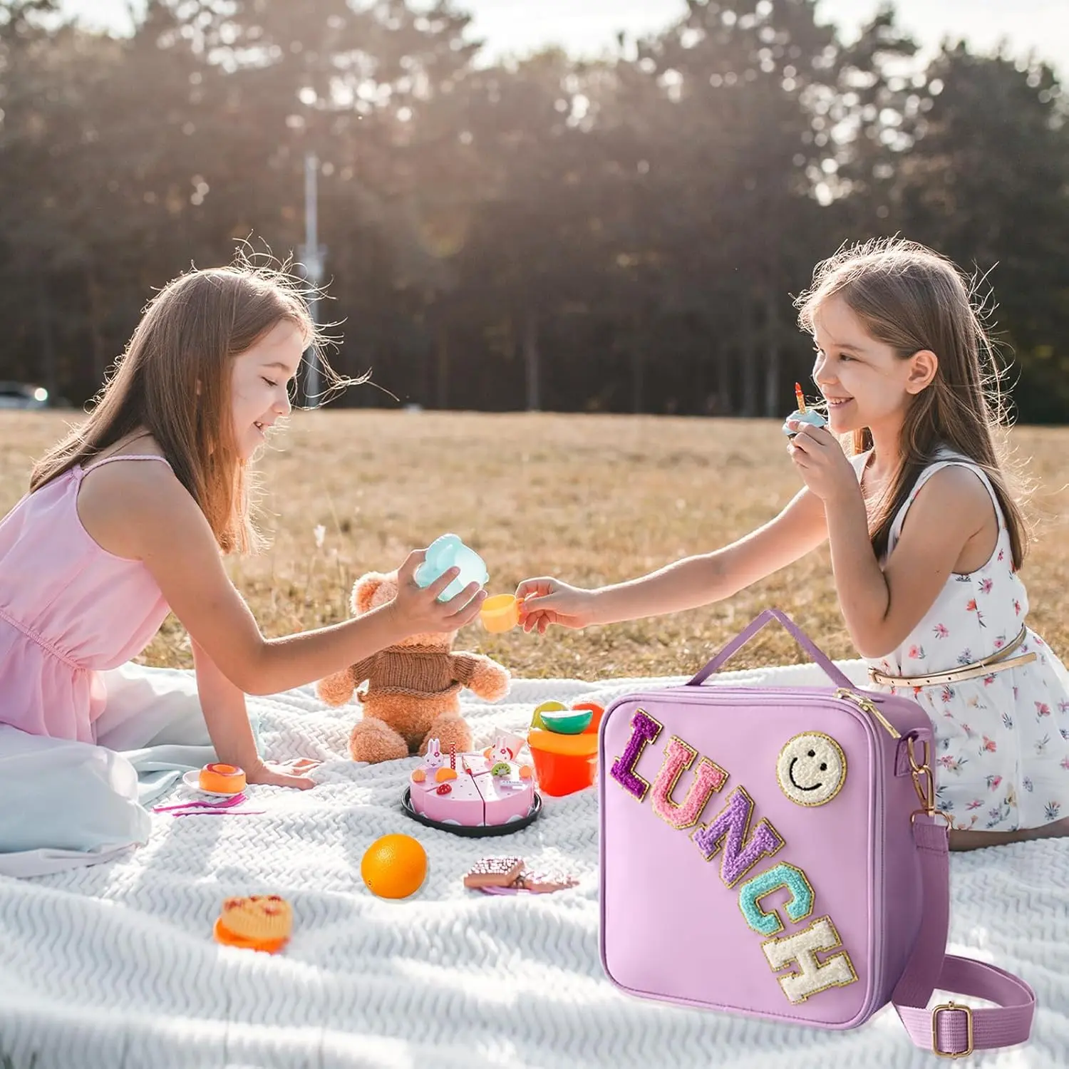 Insulated Lunch Bag with Adjustable Shoulder Strap, Nylon Preppy Lunch Box for Girls, Lightweight Leakproof Reusable Tote, Smiley Face Pattern, for School Travel Picnic, Pink – Bolsa de Almuerzo
