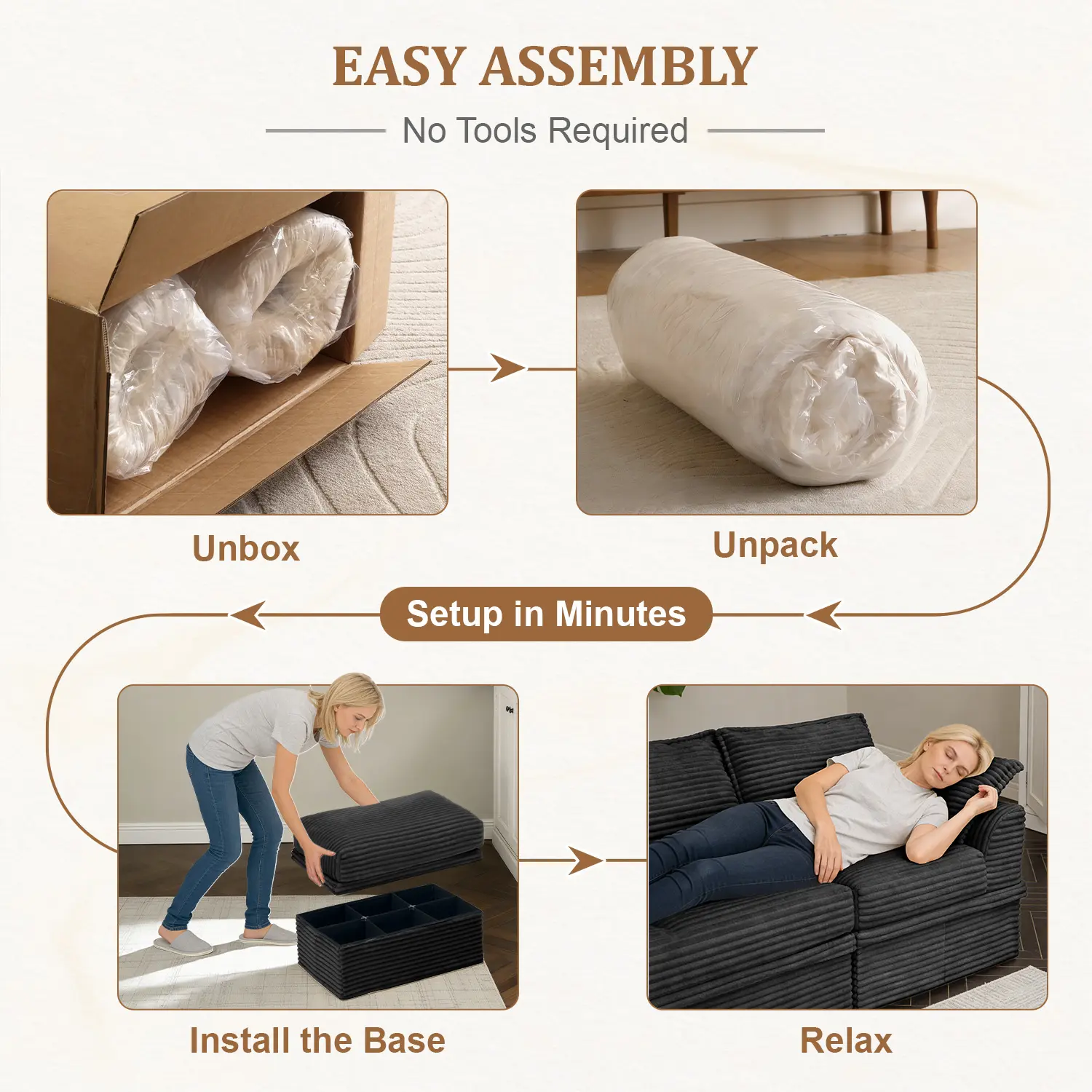 100% TOOL-FREE QUICK ASSEMBLY: Skip the frustrating manuals and missing hardware. Thanks to our innovative interlocking system, you can snap this sectional sofa together in minutes using just your bare hands. It is equally easy to disassemble, making it the perfect couch for apartments, moving, or navigating tight doorways