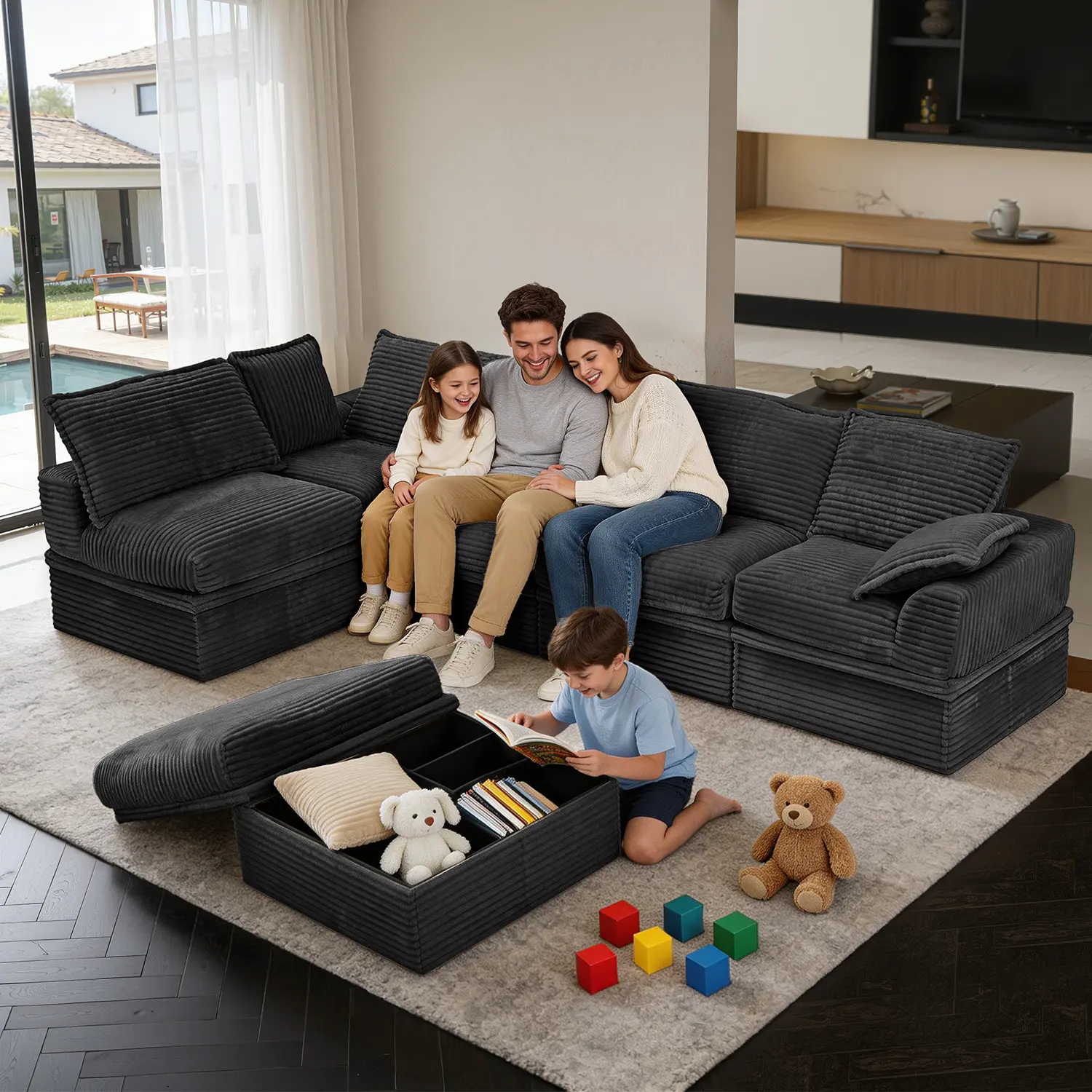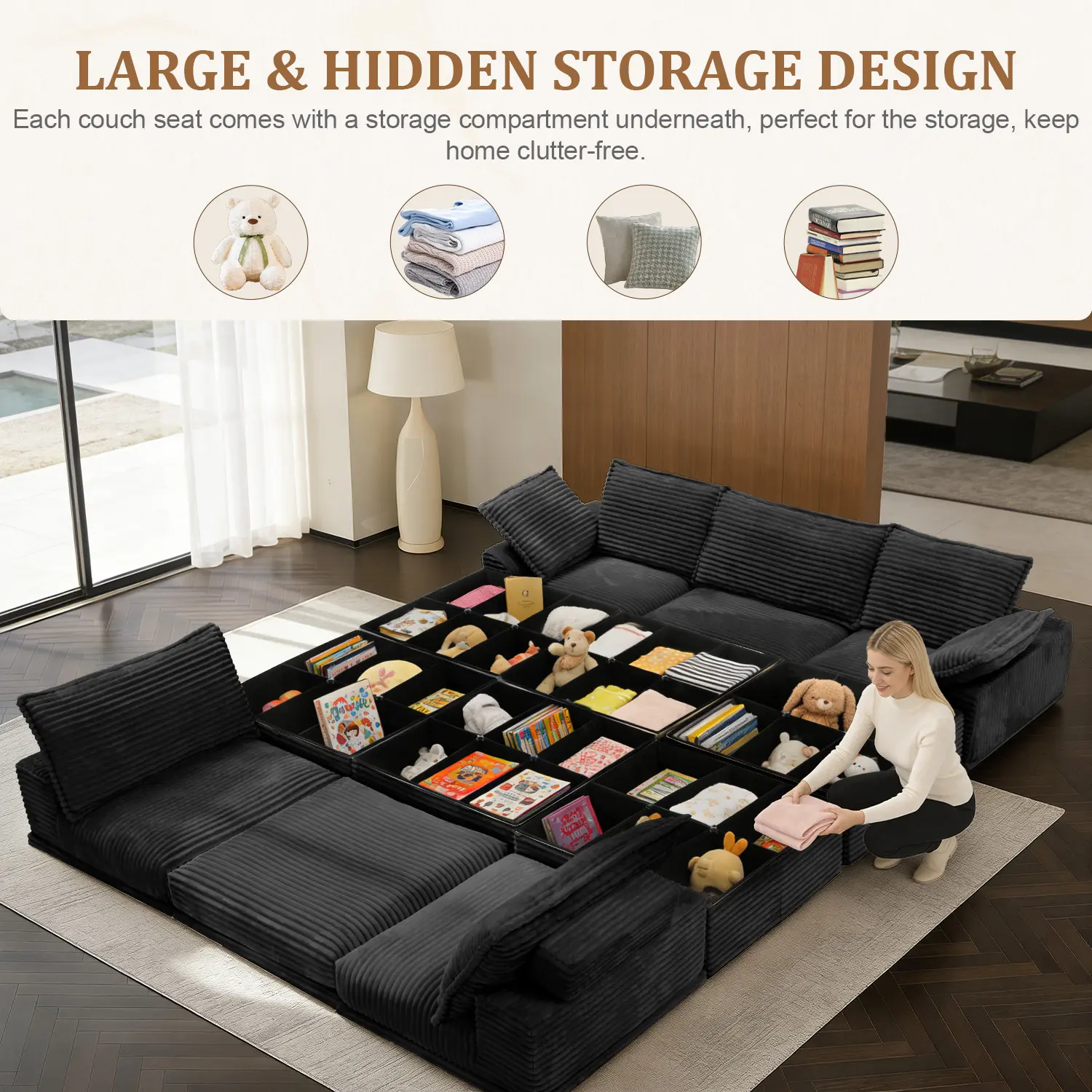 HIDDEN STORAGE UNDER EVERY SEAT: Maximize your space without sacrificing style. Unlike standard couches for living room, every single module and ottoman with storage in this set features a spacious, easy-to-access compartment. Instantly stash away blankets, toys, or pillows to keep your home perfectly organized and clutter-free