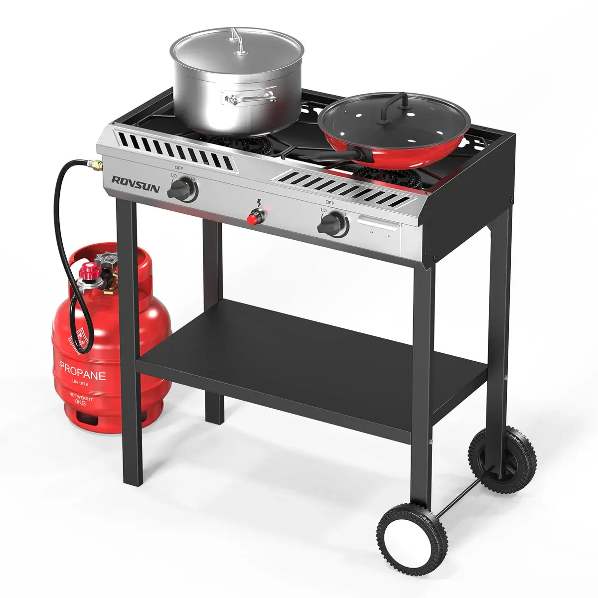 BrandROVSUNWeight37.04 lb.Width29.7 InchesDepth19.3 InchesHeight33.5 InchesStove Width29.7 InchesStove Depth15 InchesShelf Width26.4 InchesShelf Depth14.2 InchesColorBlackProduct Type2 BurnerMaterialCast IronOutput150,000 BTUHose47.2 inchWheels2