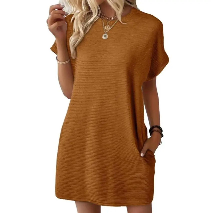 2026 Summer New Loose Crew Neck Pocket Solid Color Short Sleeve Dress for Women Casual Daily Wear Mini Dress