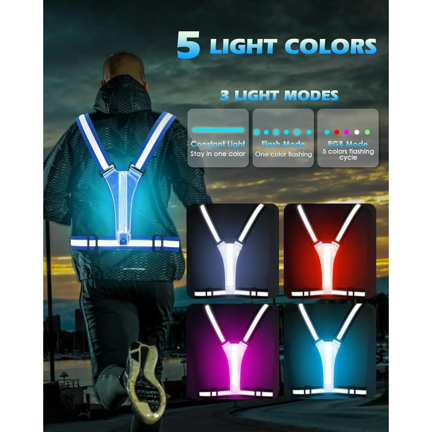 LED Reflective Vest Running Gear, 5 Lights Colors High Visibility Reflective Running Gear Rechargeable Light Up Running Vest for Walking Running Cycling, Adjustable for Men Women Kids