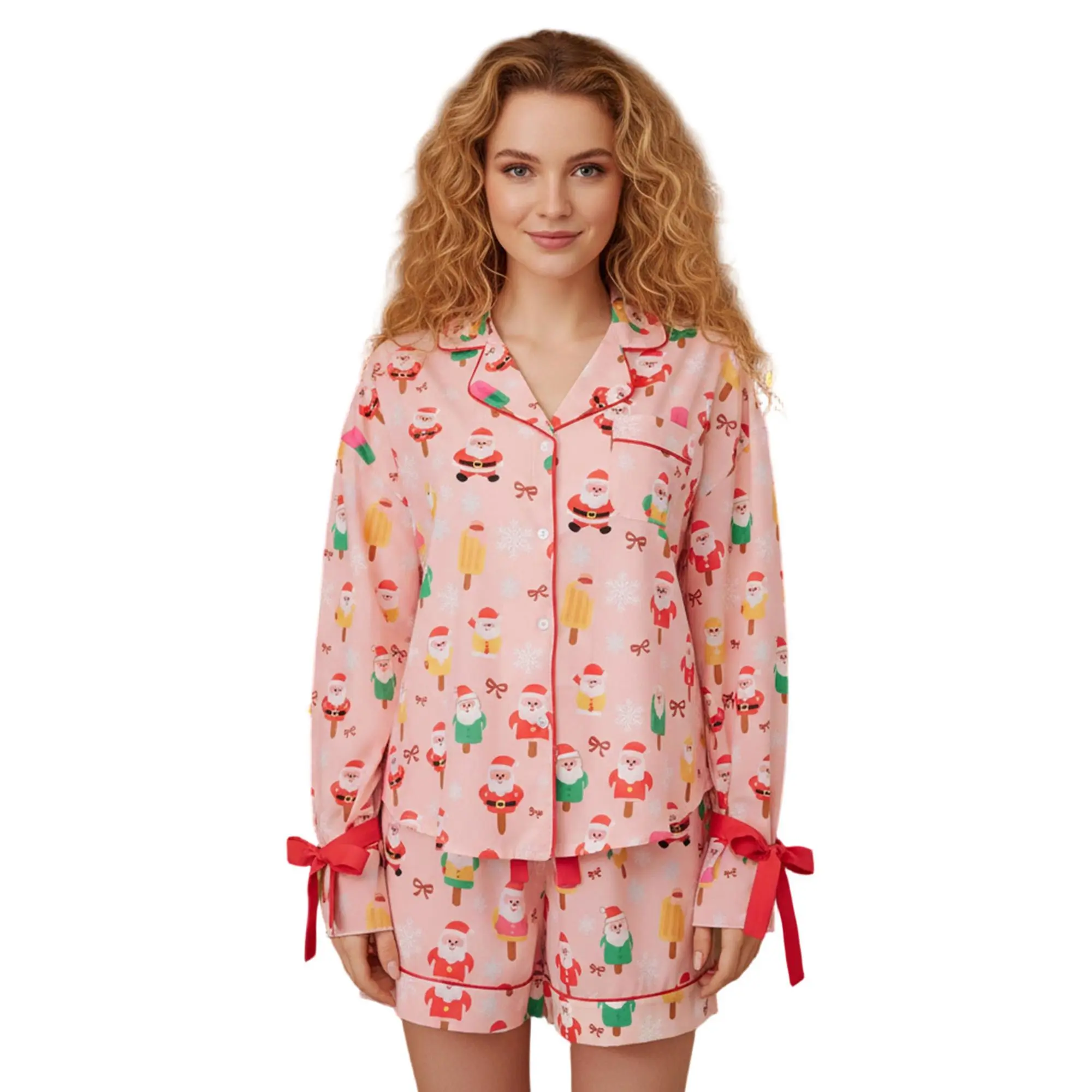 Women 2 Piece Christmas Pajama Set Santa Print Long Sleeve Button-up Tops and Elastic Waist Shorts Size (cm) S Tops Length: 63 Shoulder: 60 Bust: 108 Waist: 64 Sleeve: 52 Pants Length: 39 Hip: 106 M Tops Length: 64 Shoulder: 61 Bust: 112 Waist: 68 Sleeve: 53 Pants Length: 40 Hip: 110 L Tops Length: 65 Shoulder: 62.5 Bust: 118 Waist: 74 Sleeve: 54 Pants Length: 41 Hip: 116 Size (inch) S Tops Length: 24.8 Shoulder: 23.62 Bust: 42.52 Waist: 25.2 Sleeve: 20.47 Pants Length: 15.35 Hip: 41.73 M Tops Length: 25.2 Shoulder: 24.02 Bust: 44.09 Waist: 26.77 Sleeve: 20.87 Pants Length: 15.75 Hip: 43.31 L Tops Length: 25.59 Shoulder: 24.61 Bust: 46.46 Waist: 29.13 Sleeve: 21.26 Pants Length: 16.14 Hip: 45.67 Specification: Size: S/M/L Materials: 100% Polyester Pattern: Santa Claus Print Color: Pink Gender: Lady Package Contents: 1 * Tops + 1 * Shorts Note: 1. Please understand there may be a 1-2 cm deviation exist. 2. Due to the lighting and monitors, there is a slight difference between the picture and the real item. Promise: If the product has any quality problems, please relate with us, we will help you solve the problem as quickly as possible.