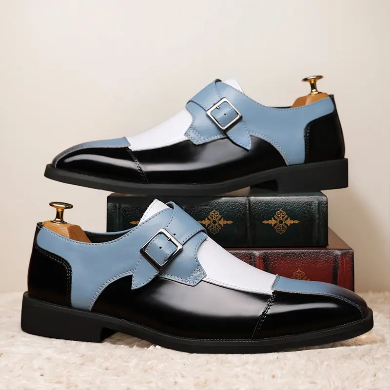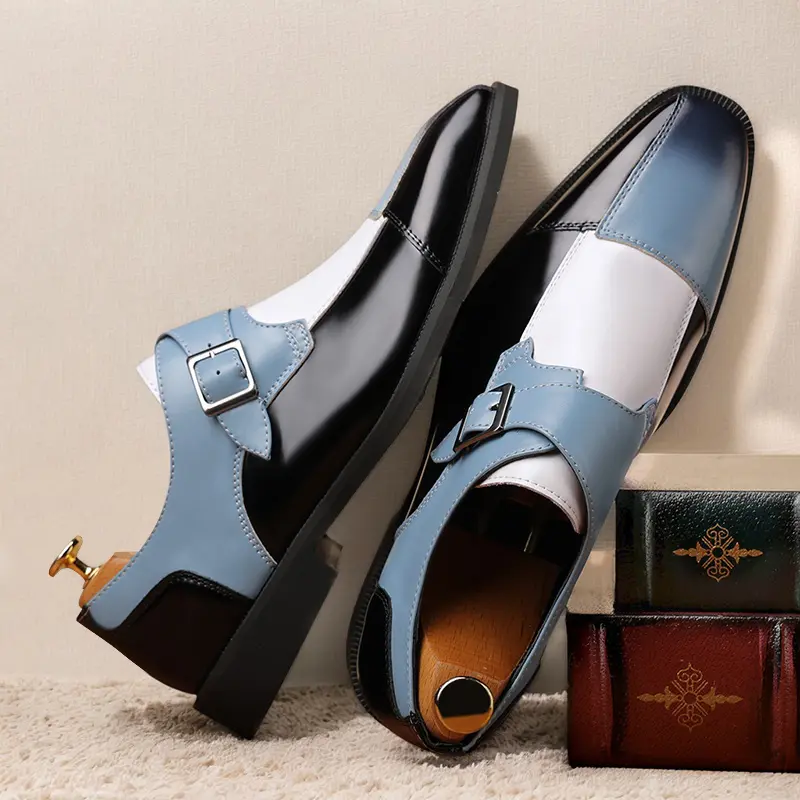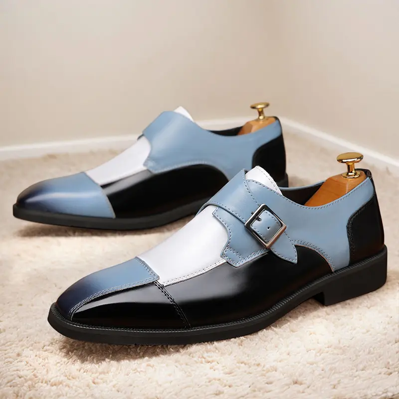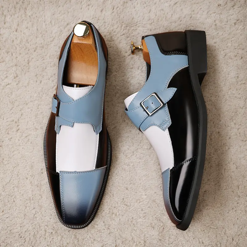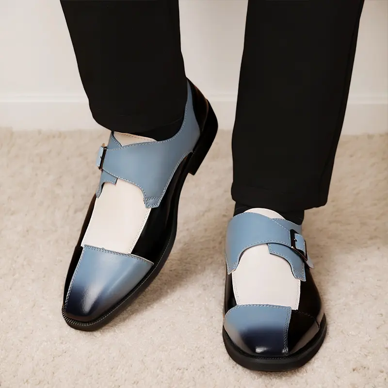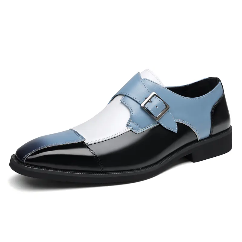 These men's formal shoes feature a striking multi-color design, combining glossy black, soft blue, and crisp white leather with a timeless single monk strap and buckle detail. The sleek, polished silhouette delivers a sophisticated, contemporary look, perfect for making a statement at business meetings, weddings, and formal events.