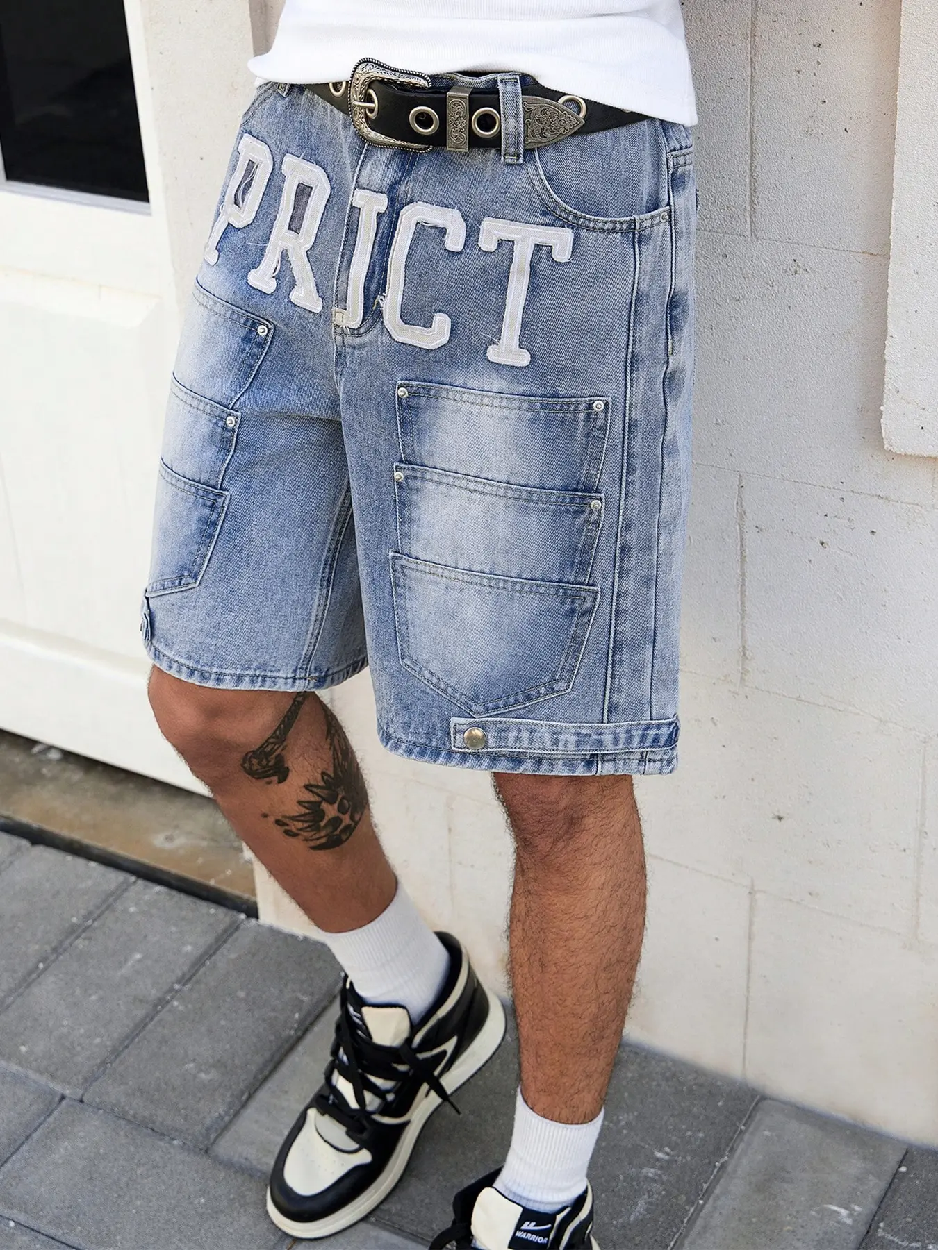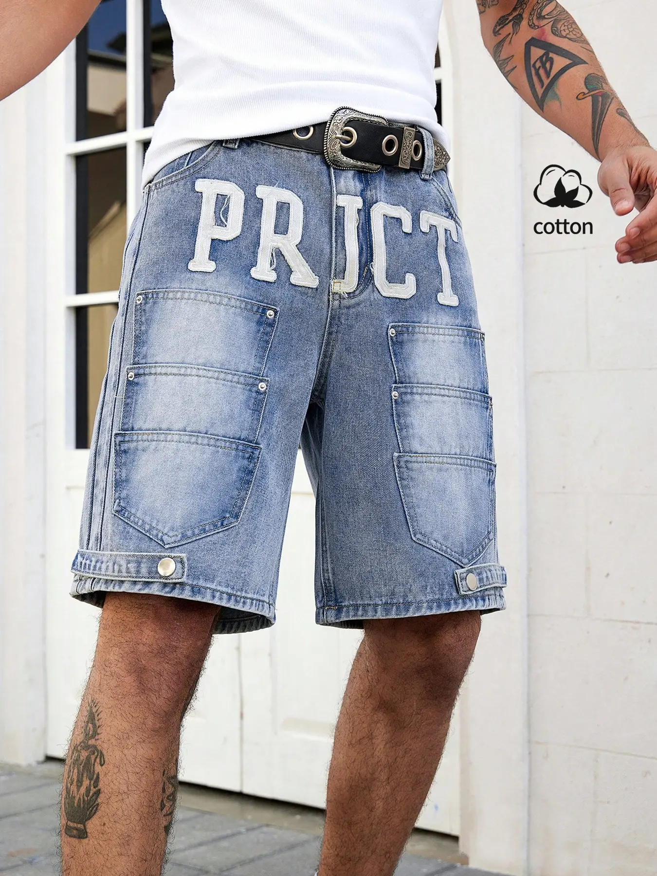 Multi-pocket denim shorts, denim cargo shorts, jeans—Y2K American street style embroidered vintage shorts for both men and women, casual letter embroidery design, perfect for summer fashion everyday wear, versatile casual style.