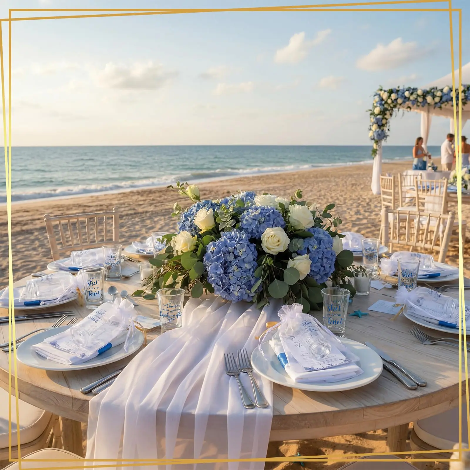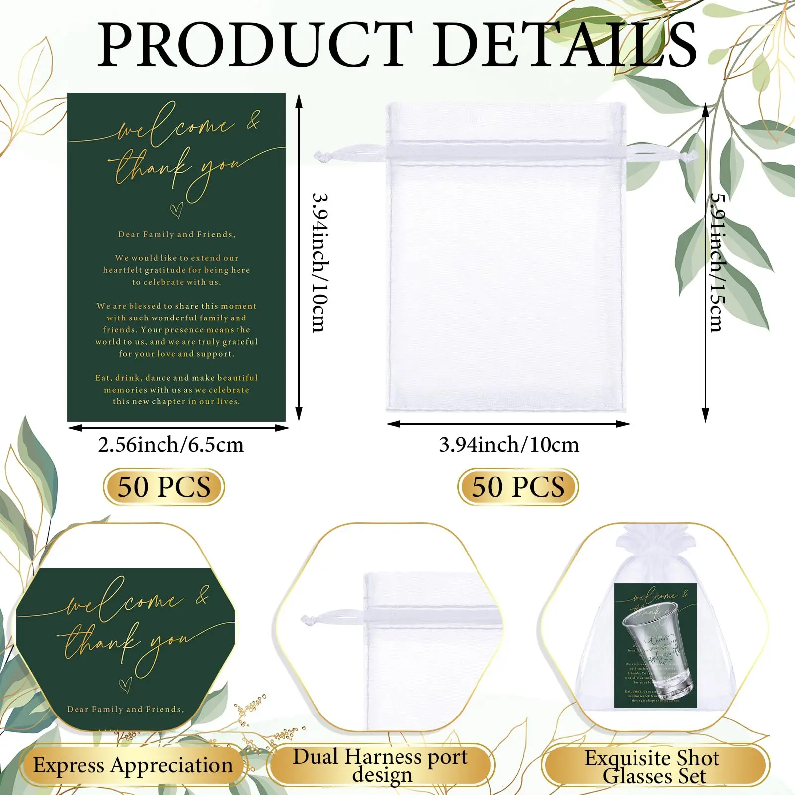Includes 50 clear shot glasses, 50 thank-you cards, and 50 organza gift bags — everything you need for effortless gifting.