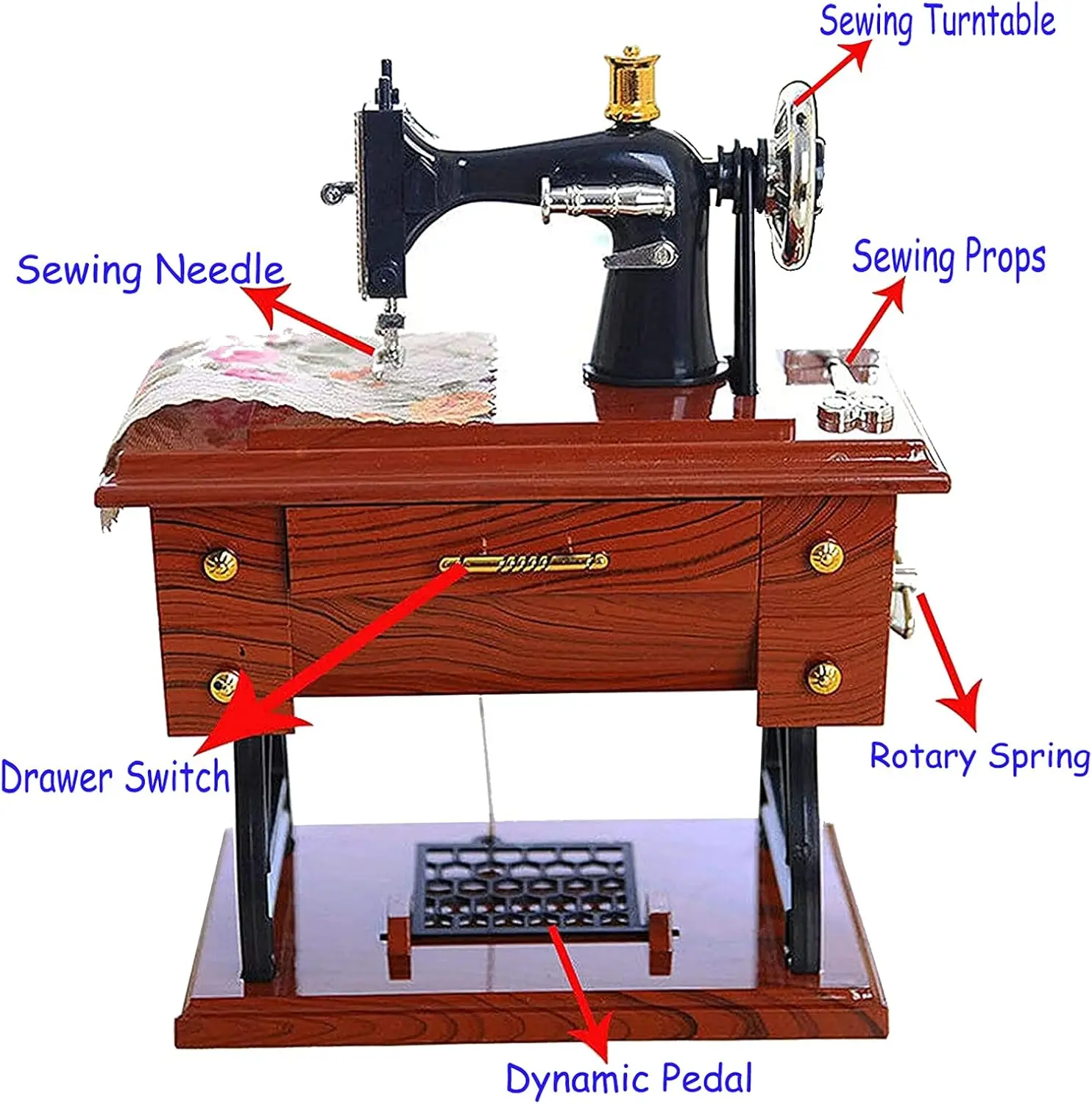 ·How to Use - Open the small drawer, music will be sounded, close the small drawer, music will stop. With the music sounded, pedals, leather strap wheel, and needle hole will be rotated.