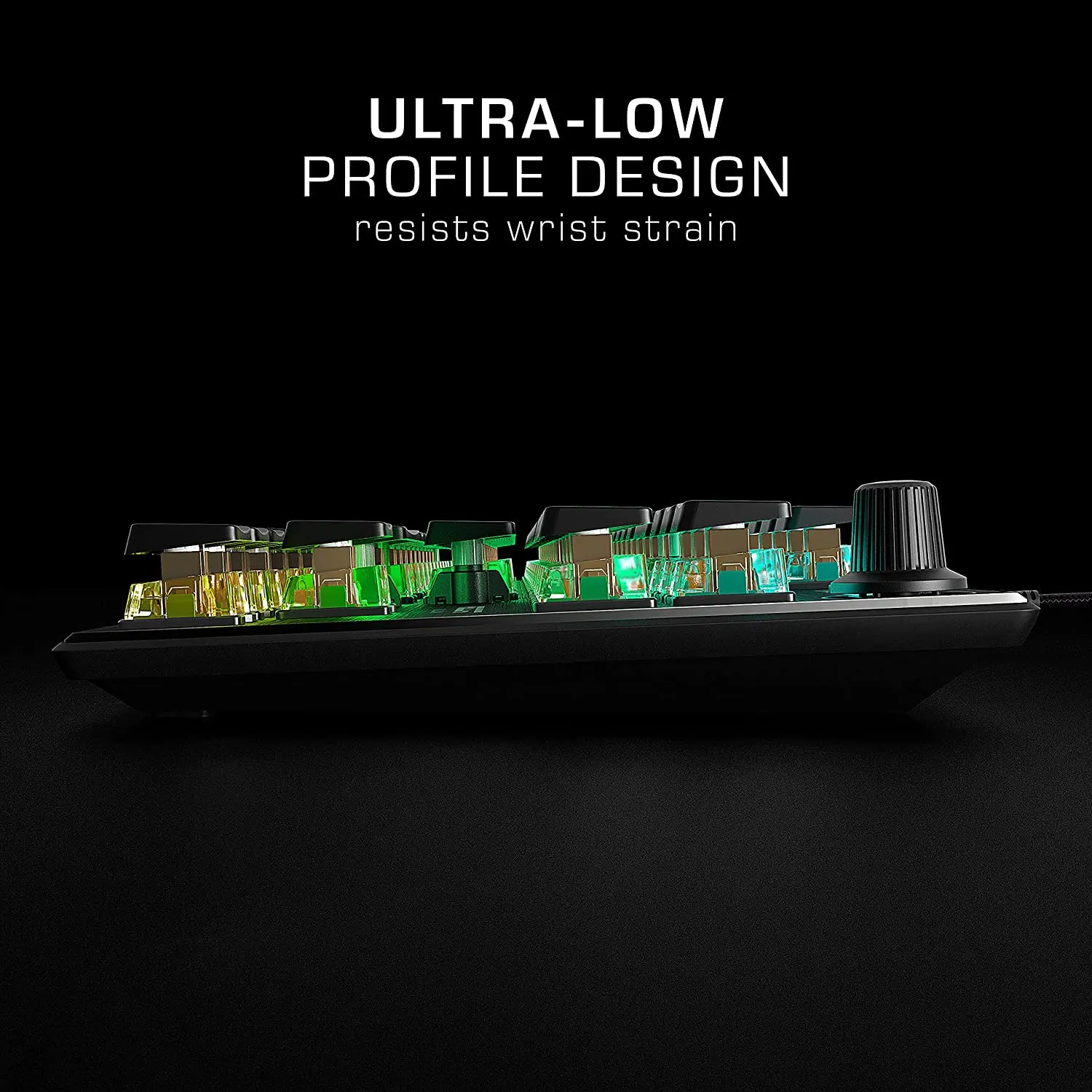 The ROCCAT Vulcan TKL is a tenkeyless variant of the award-winning Vulcan keyboard family. This smaller form factor means gamers have room for a larger pad and can use a bigger range of a mouse movements, ultimately giving them greater accuracy. The tactile Titan Switch Mechanical delivers the industry’s best in speed and responsiveness. The switch adds to a comprehensive feature set that gamers know and love. The low-profile design is engineered for comfort. Impressive durability and build quality thanks to its reinforcing black anodized aluminum top plate, switches rated to 100 million keystrokes, dedicated mixer-style audio controls and per-key AIMO RGB lighting. To ensure additional peace of mind we provide a 2-year limited manufacturer warranty.