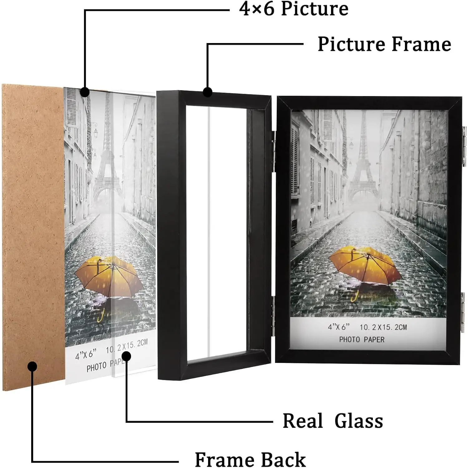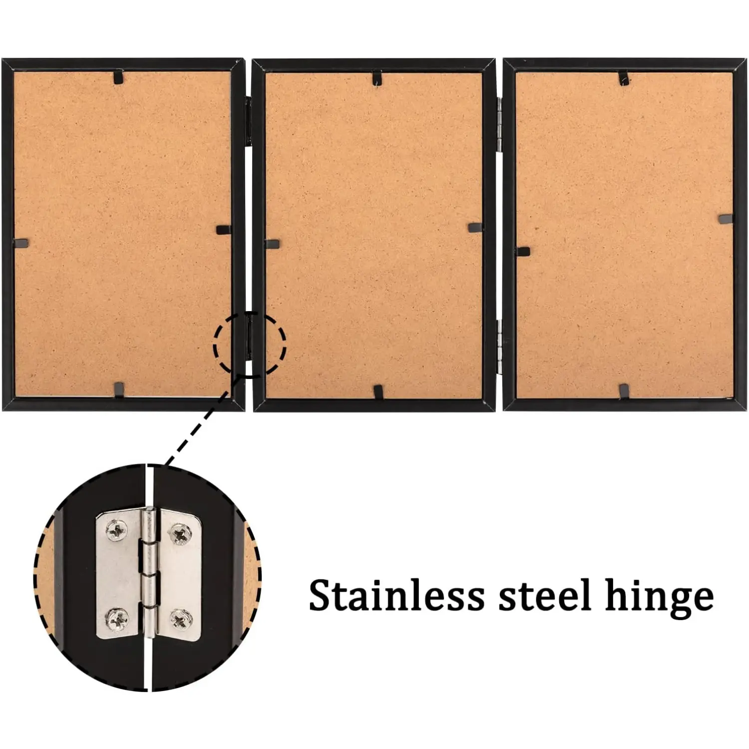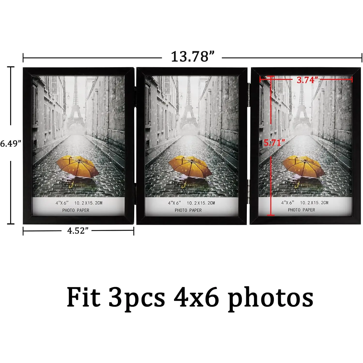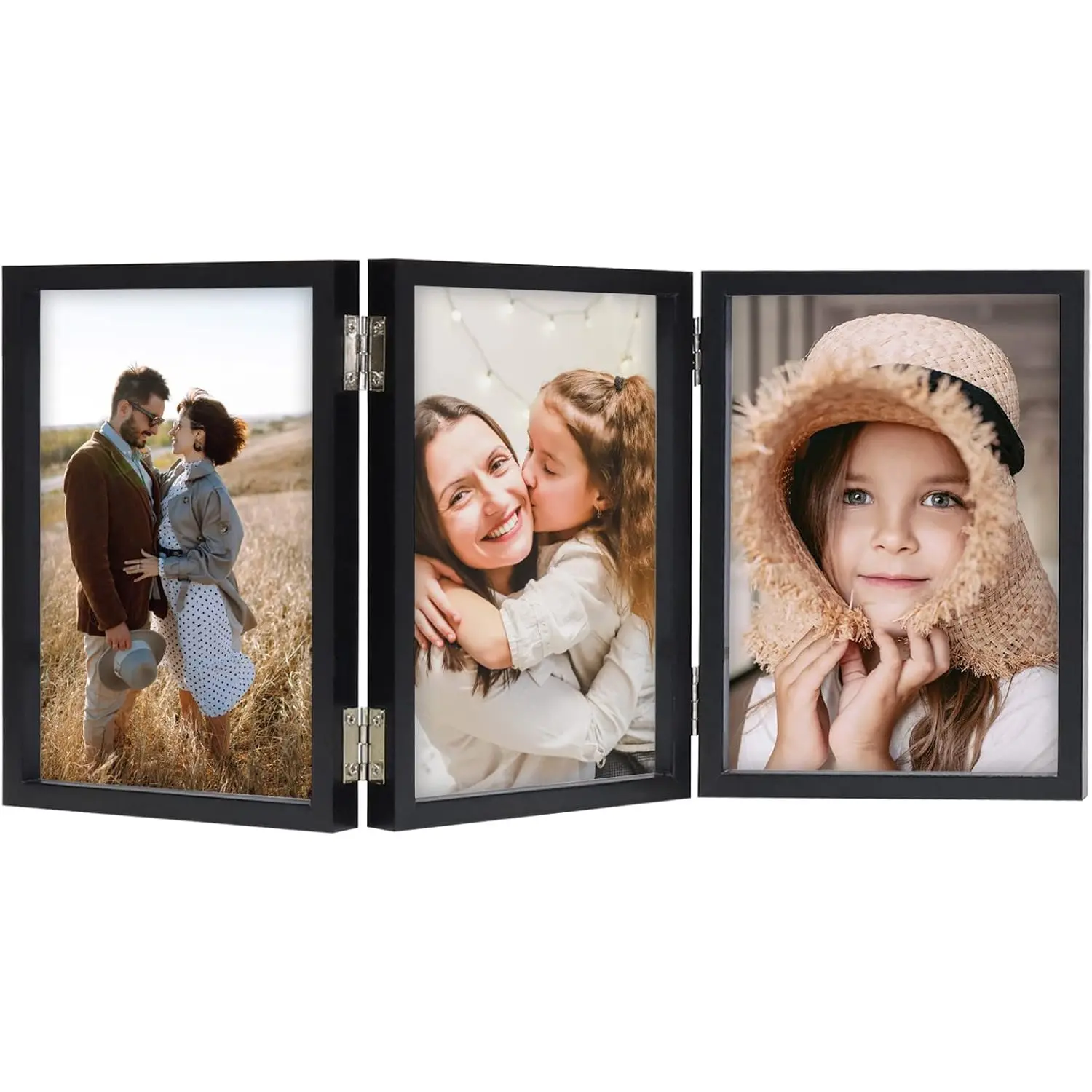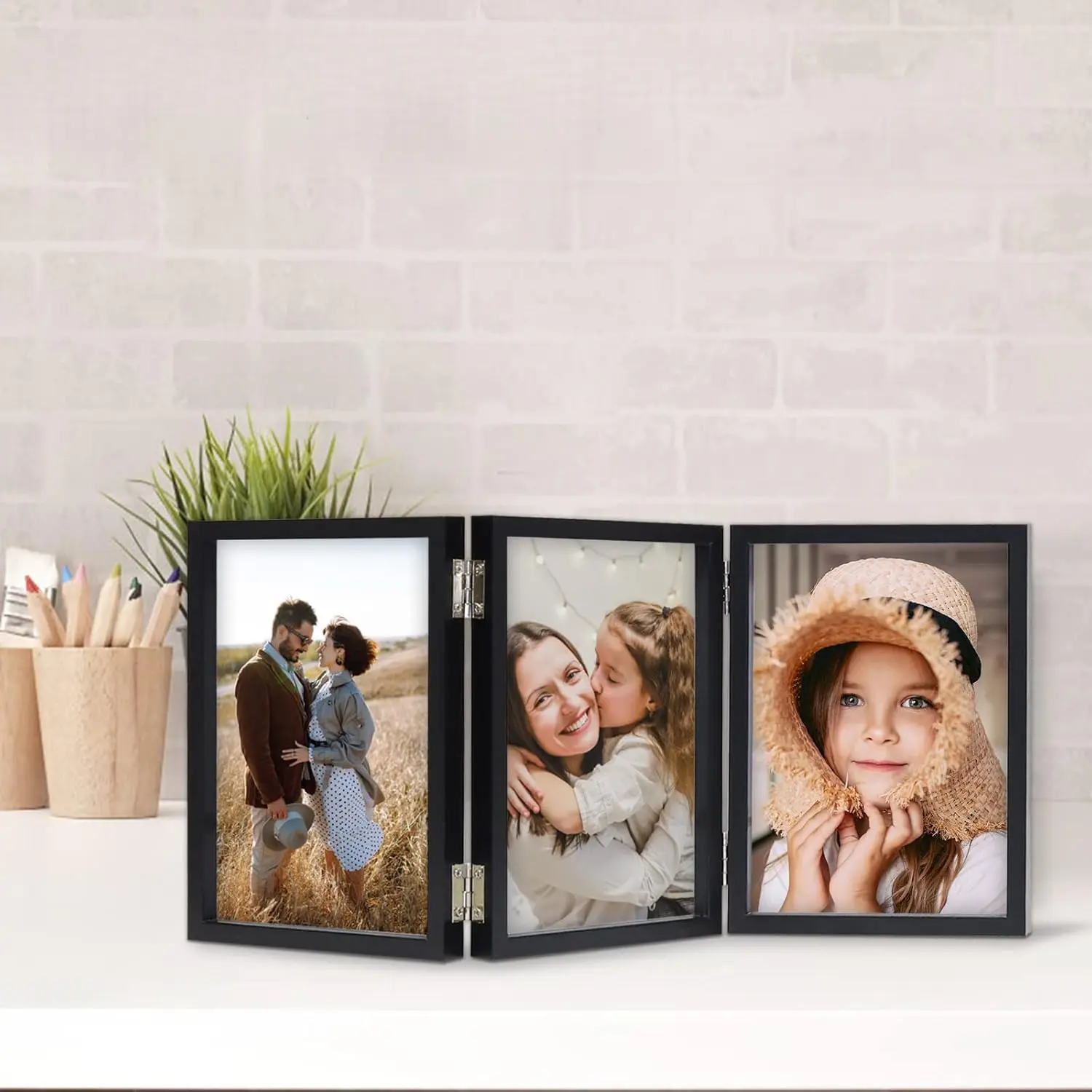 4x6 Triple Picture Frame Hinged 3 Photos – Folding Photo Frame with Real Glass, Vertical Stand Black Collage Frame for Tabletop Display