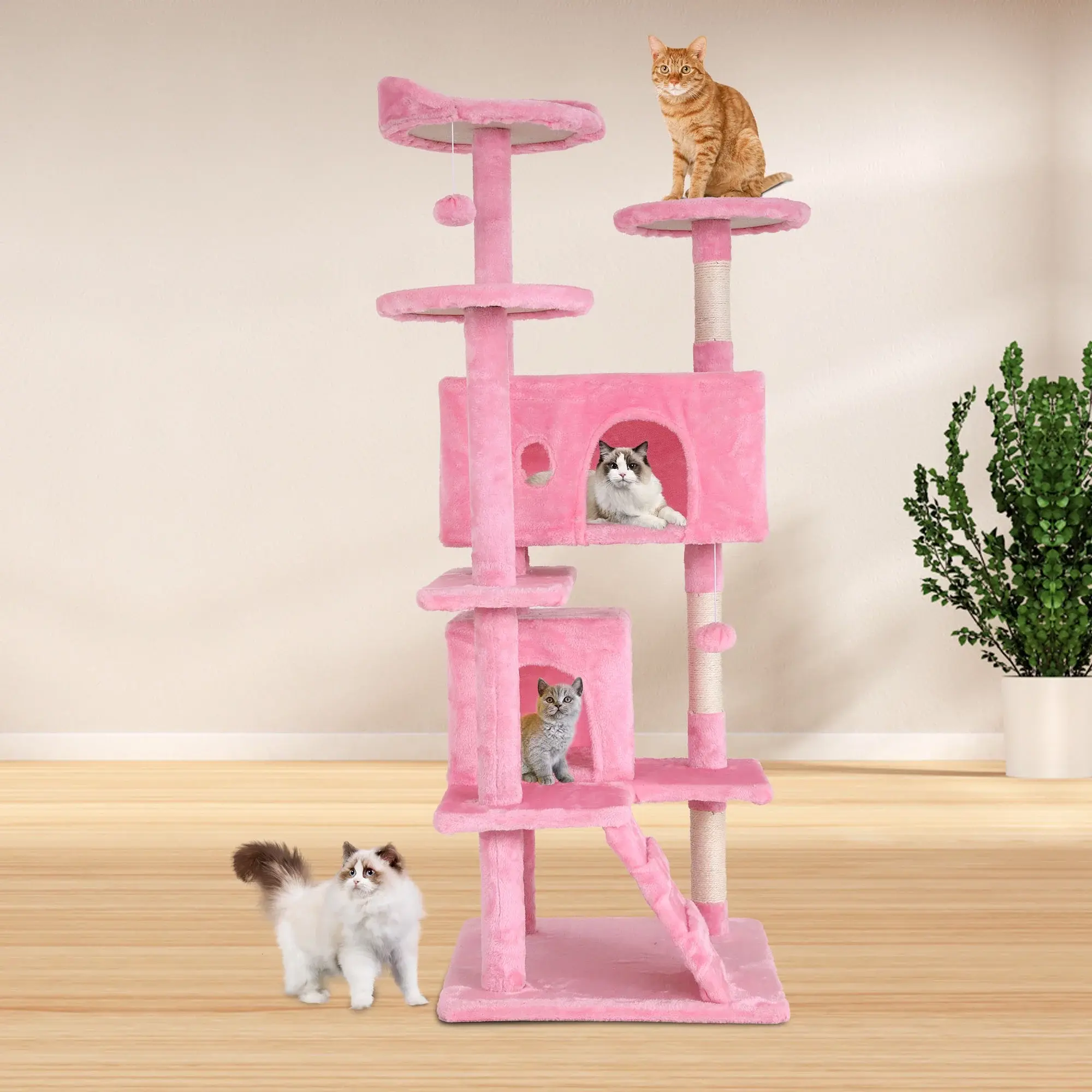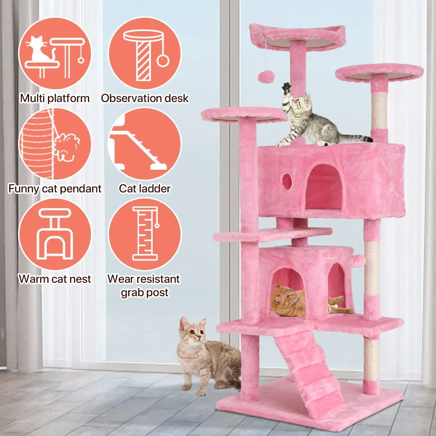 😻【Material of High Quality】This cat tree is made of high density wood veneer board, well balanced design, smooth and sturdy. The natural sisal, it can withstand the long-term scratching of cats. Thickened felt cloth offers different sense of scratching. Comfortable cushions inside the cat house and top perches are removable and machine washable, soft and easy to clean. 😻【Large Space】This cat tree comes with 2 Spacious room, 3 top of platforms, 2 hanging balls, as an activity and playing centre totally meet the jumping and scratching nature of your little cat. Moreover the condo makes sure that your cat have a good resting place and have a sweet dream. 😻【Sturdy and Secure】Never need to worry about the security and the firmness of this cat scratch tower. Its heavy weight, thickened bottom plate, posts of diameter 8.5cm(much thicker than normal ones) make it more stable than the others. cats can easily and safely leap on or off this kitty tower without worries about wobbling or toppling over. scratching posts for indoor cats adults wood cat tree clearance 😻【Protects Your Furniture】This compact cat furniture is composed of good quality particle board with polyester covering, which is very modern and comfortable. Multiple scratching posts are covered by 100% natural sisal ropes which are perfect for your cats to scratch and climb, not scratching your furniture anymore. kitty tower indoor cat house cat tower with scratching post 😻【Easy to Install】With a clear installation for instruction and the attached accessories you will have no problem installing the kitty condo. The 4 floors design meets the jumping nature of the cat. They can jump, have a rest or play with friends in it. And feel free to contact us if you have any problem with the cat tree house. 🐈FEATURE: 🐱The cat tree with high density wood board, well balanced design, smooth and sturdy. 🐱This cat house has 2 spacious room, 3 top of platforms,2 hanging balls. 🐱This cat tower is comfortable, safe, stable and sturdy. 🐱The 4 floors design meet the jumping nature of cat. 🐱This cat condo is a good place for cat to play and have a good resting. 🎁SPECIFICATIONS: Color:Pink Material:Engineered Wood Size:19.3×19.3×54.7 inches (L×W×H) Item Weight:26 lbs