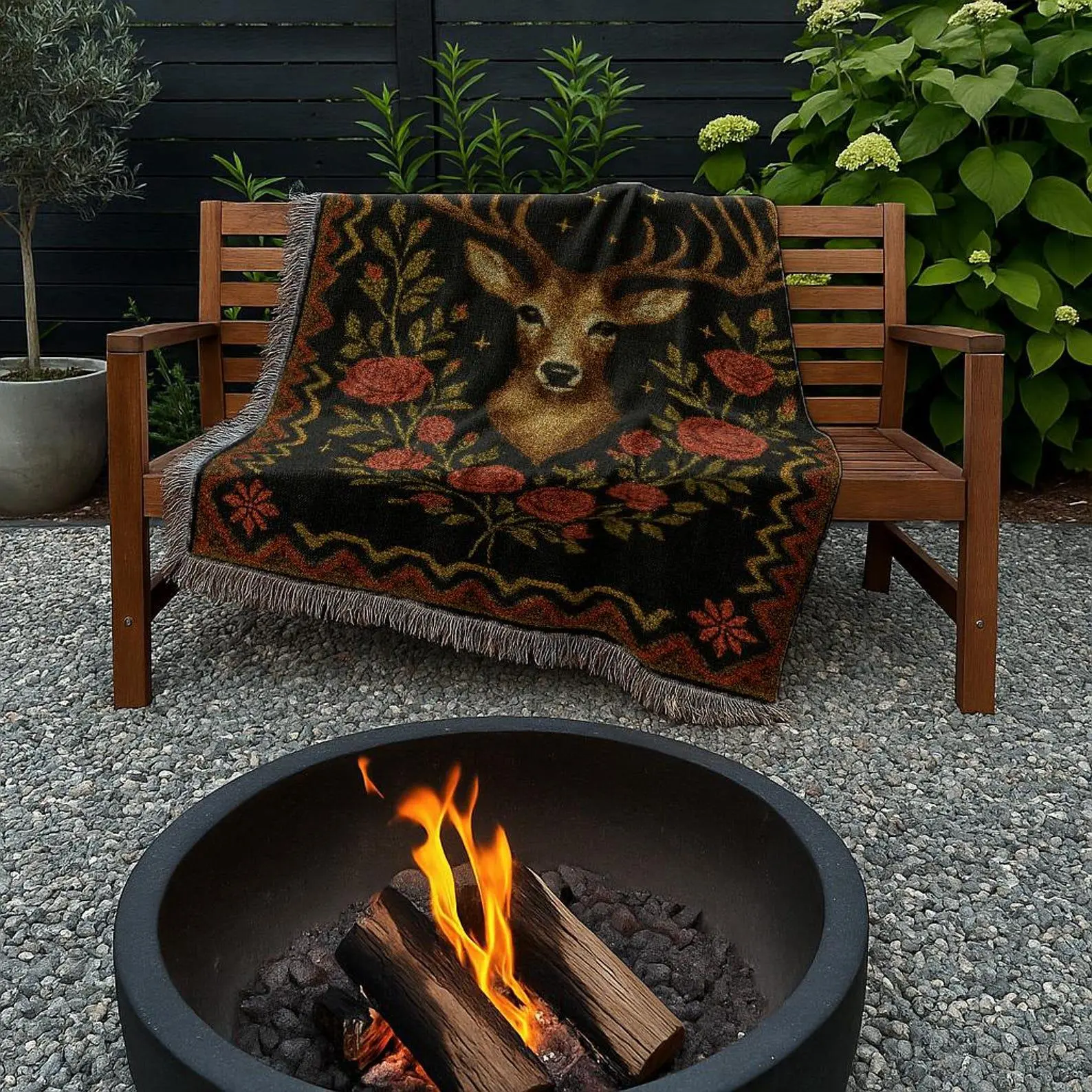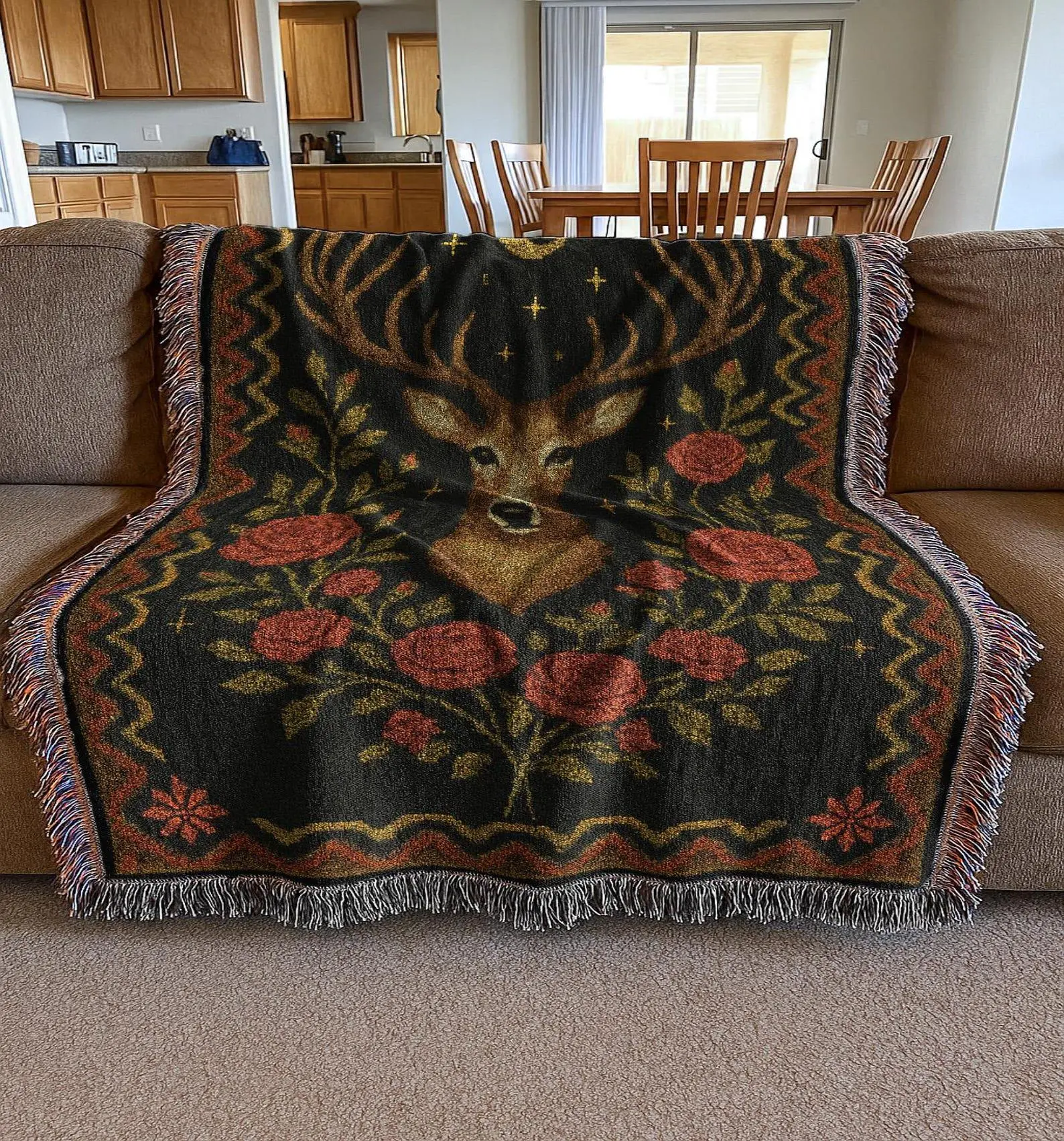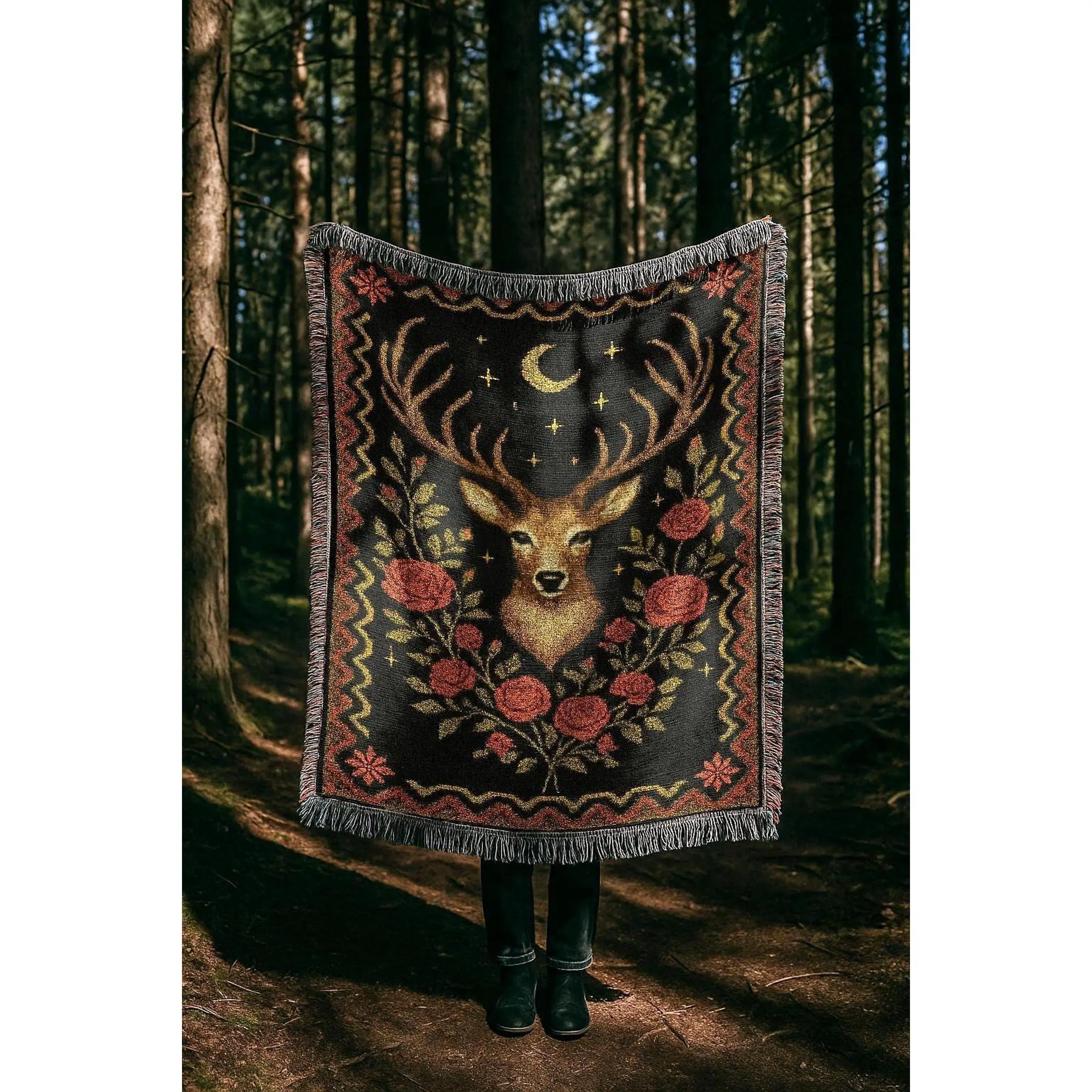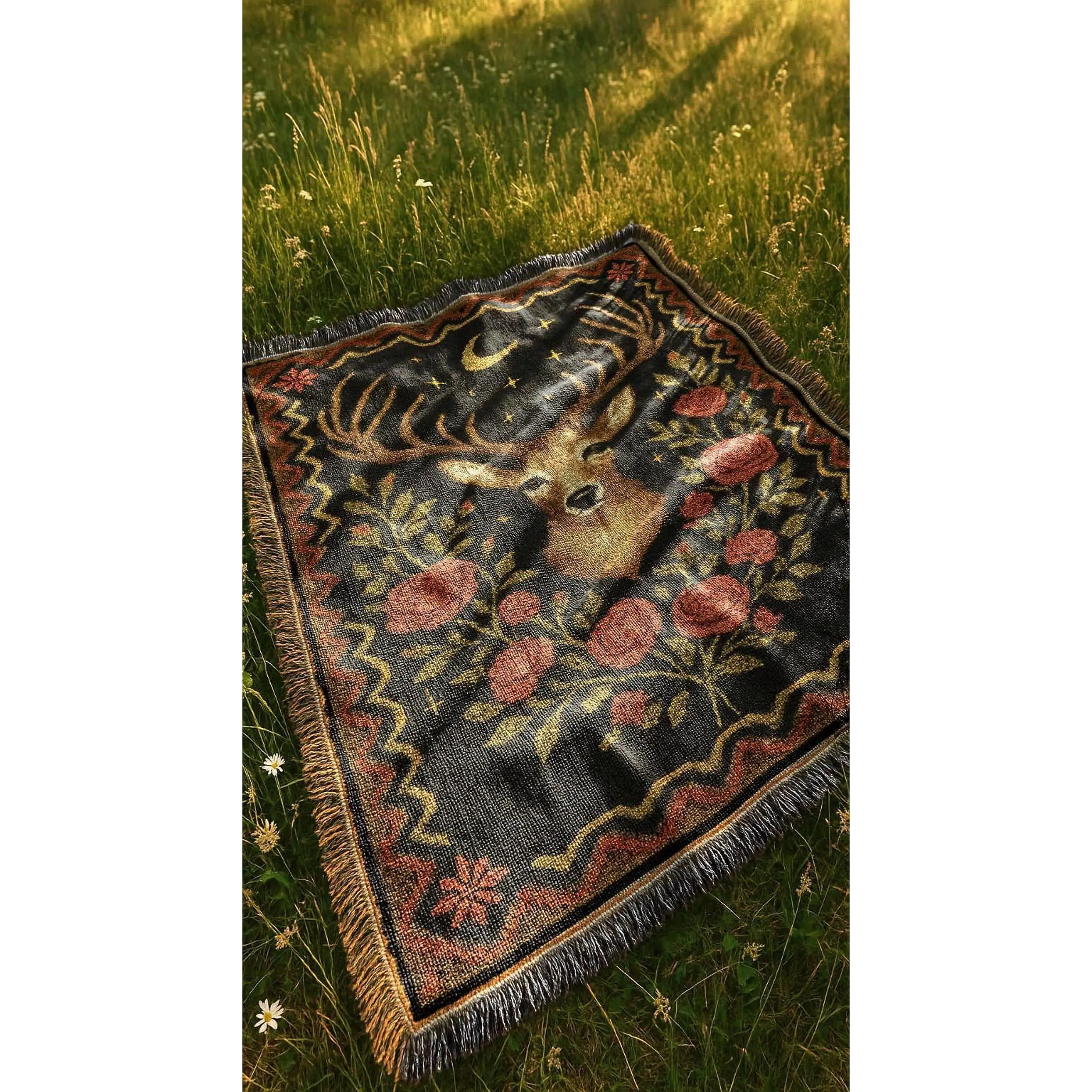 Deer and Roses Blanket | Dark Western Celestial Woven Tapestry | Rustic Country Forest Cabin Elk Throw Blanket