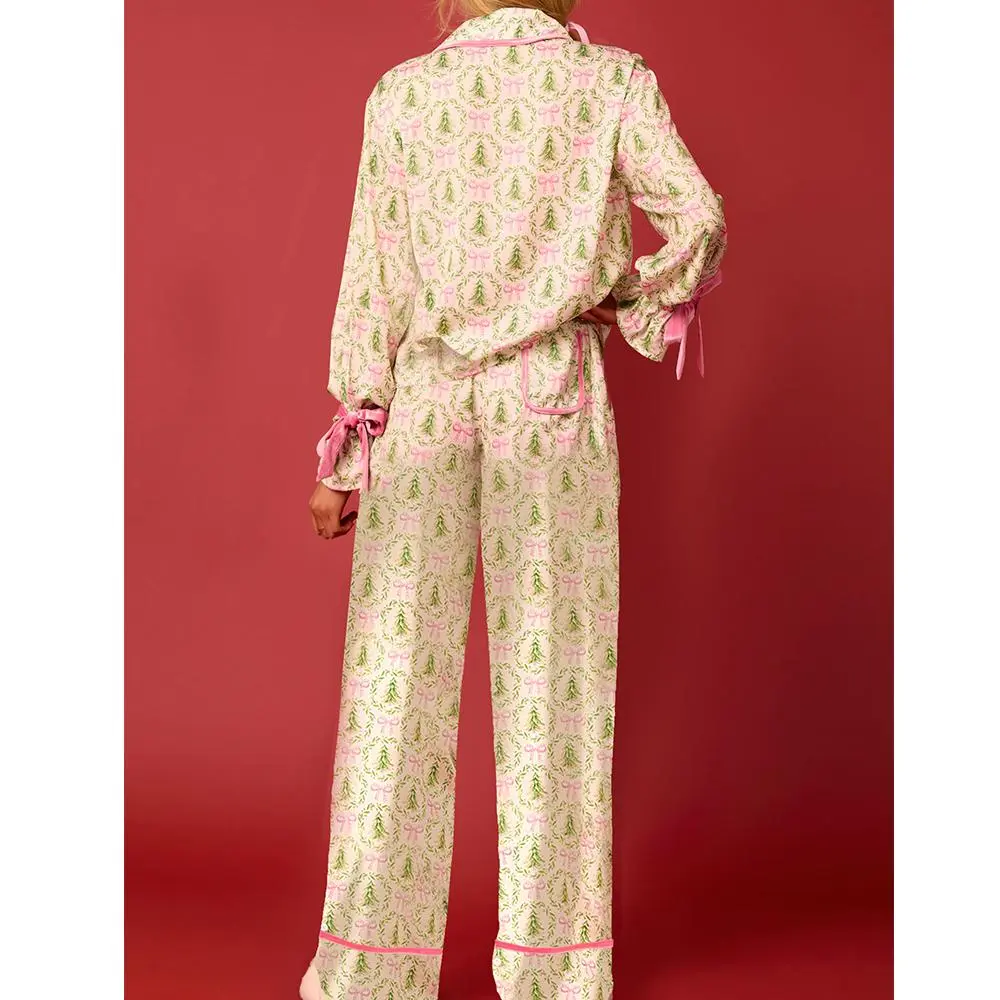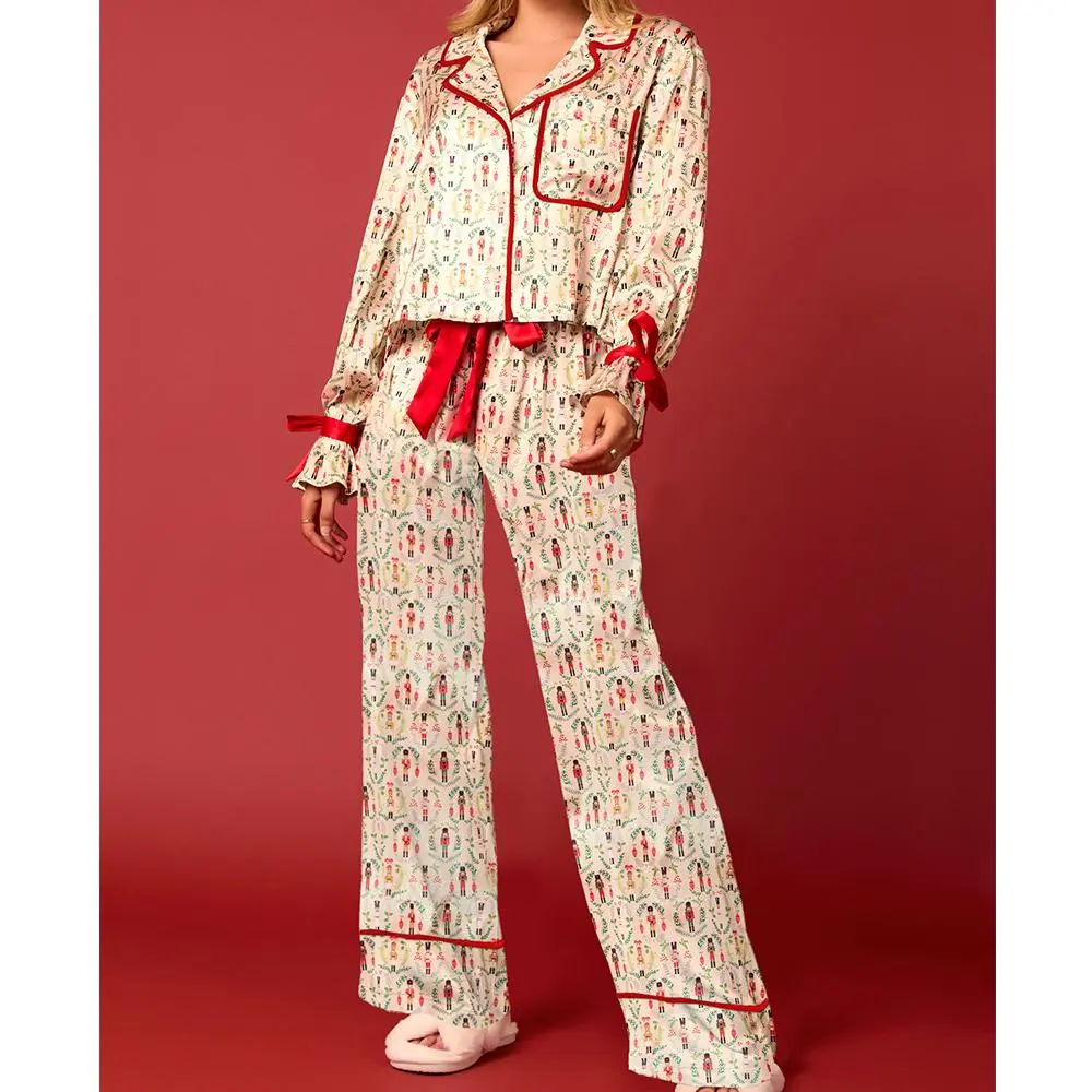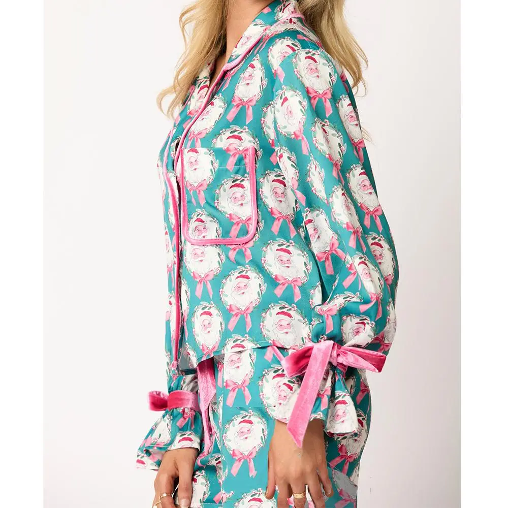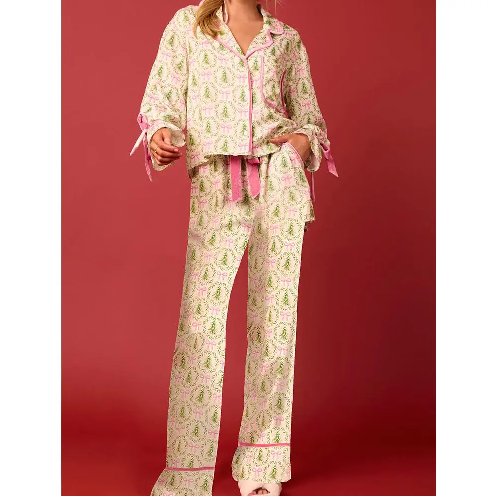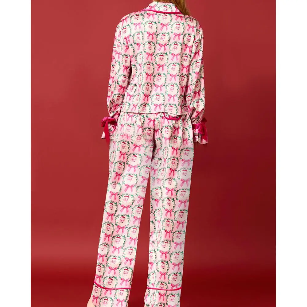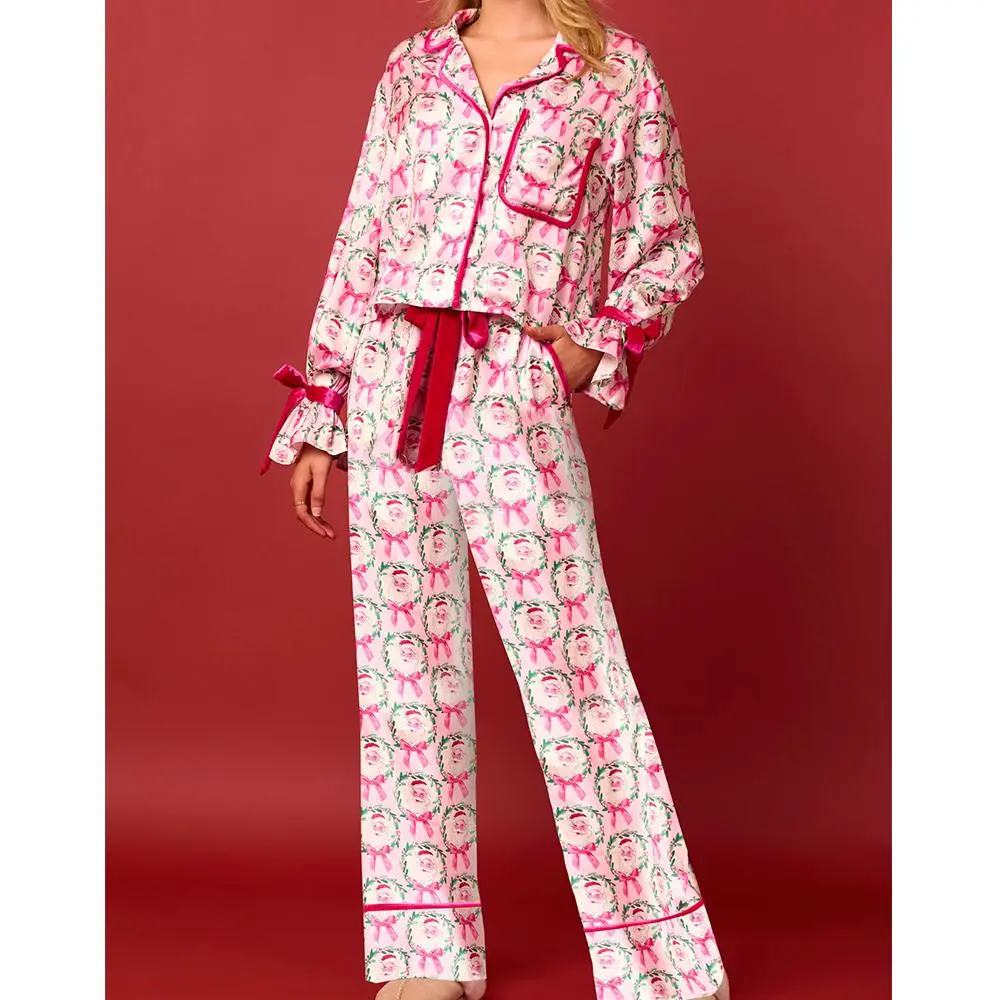 Women 2 Piece Christmas Pajamas Set Bow Tie Santa Claus Long Sleeve Button Shirts Wide Leg Pants Cute Pjs Sets Xmas Sleepwear