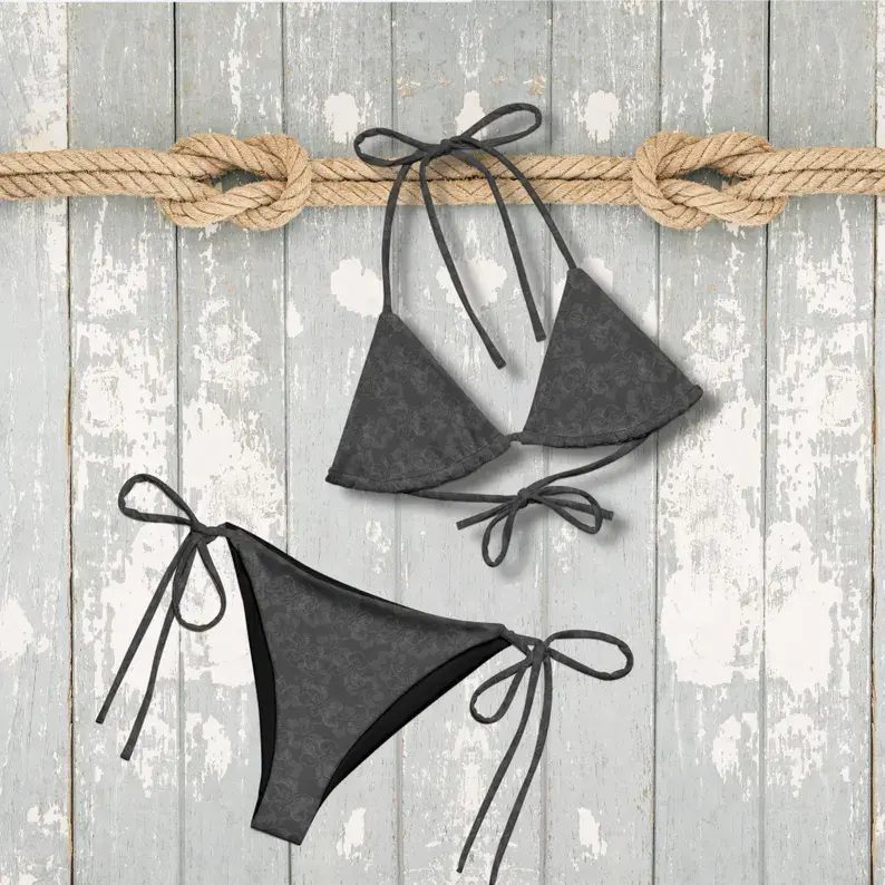 5. Tropical Floral Matching Swimsuits: His & Hers Charcoal Vacation Swimwear