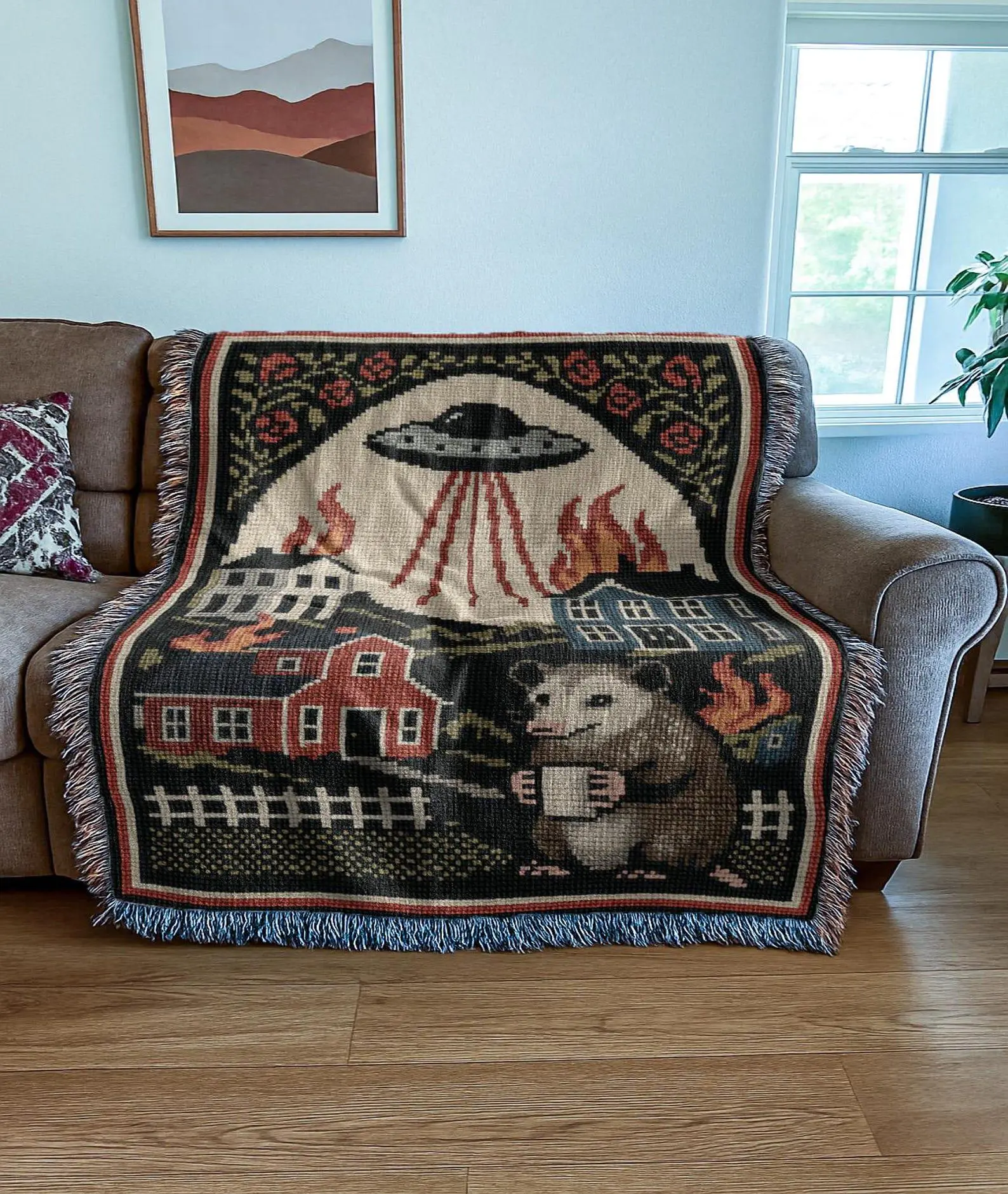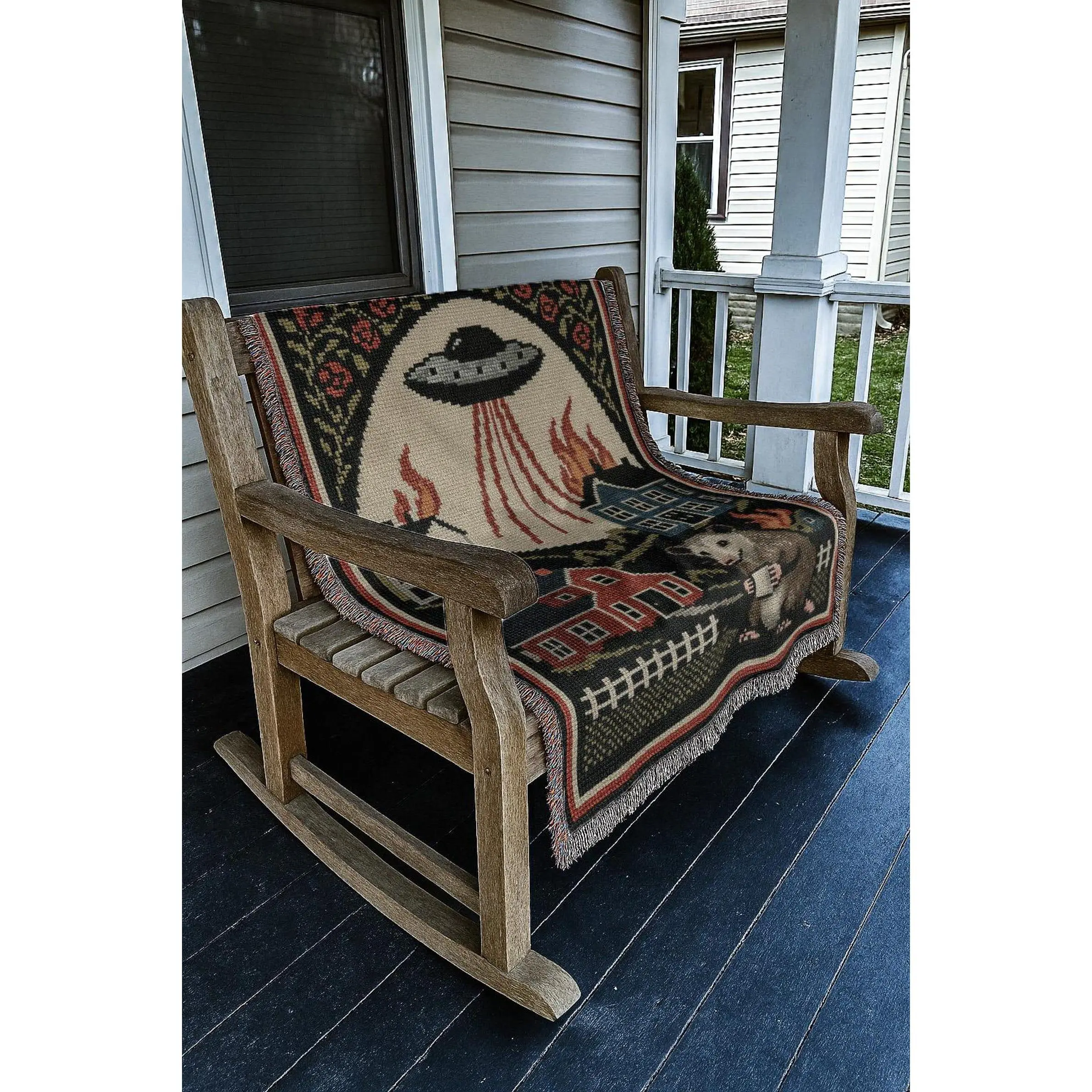 UFO Invasion Blanket | Chaotic Bohemian Western Woven Tapestry | Alien Opossum Country Throw Blanket
