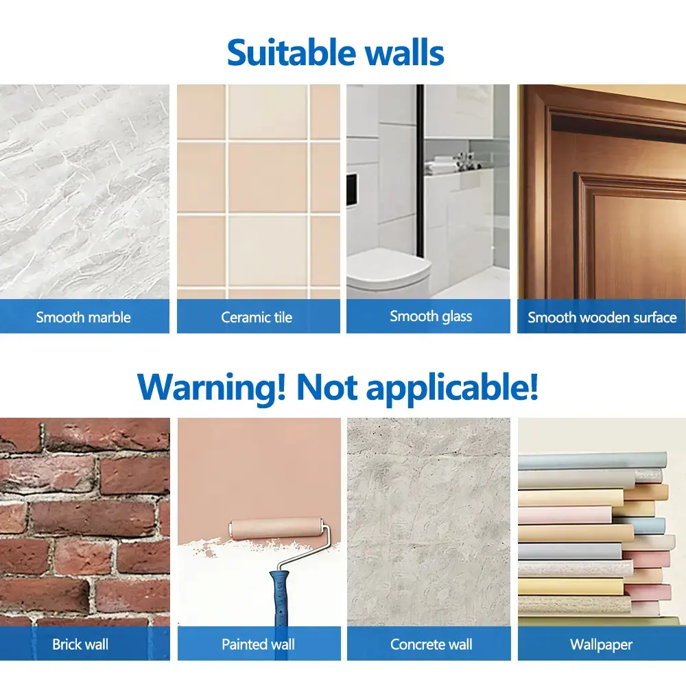 These hooks are designed for smooth surfaces such as tiles, glass, and smooth wooden doors. Adhesion may be weaker on latex paint walls and other rough surfaces. Before installation, please ensure the wall surface is clean. First, clean the wall surface, then apply firm pressure to remove air and create a vacuum, then tighten the hook to enhance adhesion! Let it sit for a few minutes before using it to achieve a more secure hold!️️