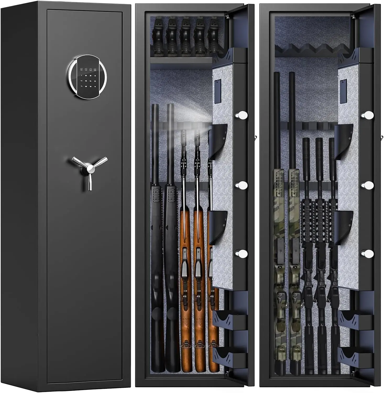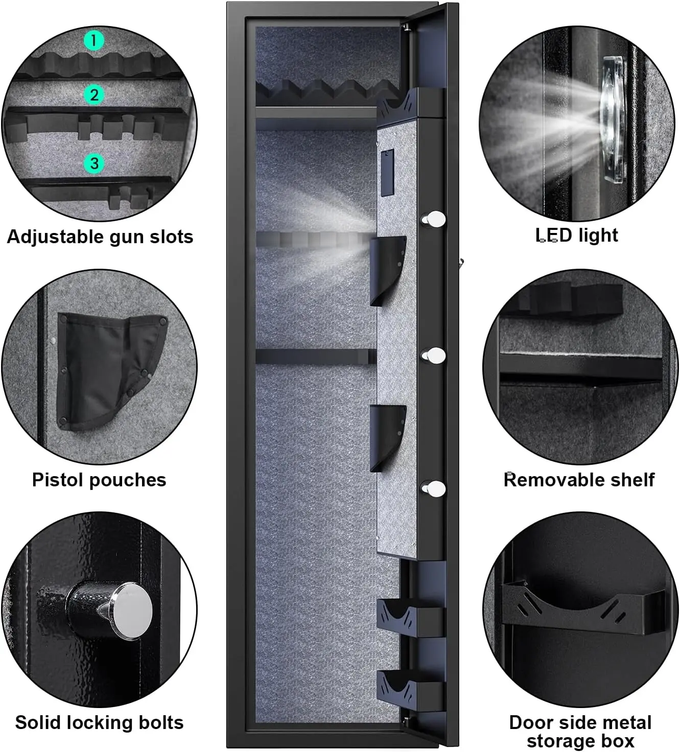 ·【Detail Design】Our rifle safe has a removable shelf and adjustable pistol rack for easy storage of up to 5 pistols. It can store long guns up to 53.5'' when the shelf and pistol rack are removed. Moreover, 2 adjustable gun slots can be adjusted to fit your rifle height, and you can store up to 5 long guns. And the soft velvet interior protects your guns is protected from scratches. Additionally, the trigeminal handle is sleek and wear-resistant. It can be removed to prevent theft.