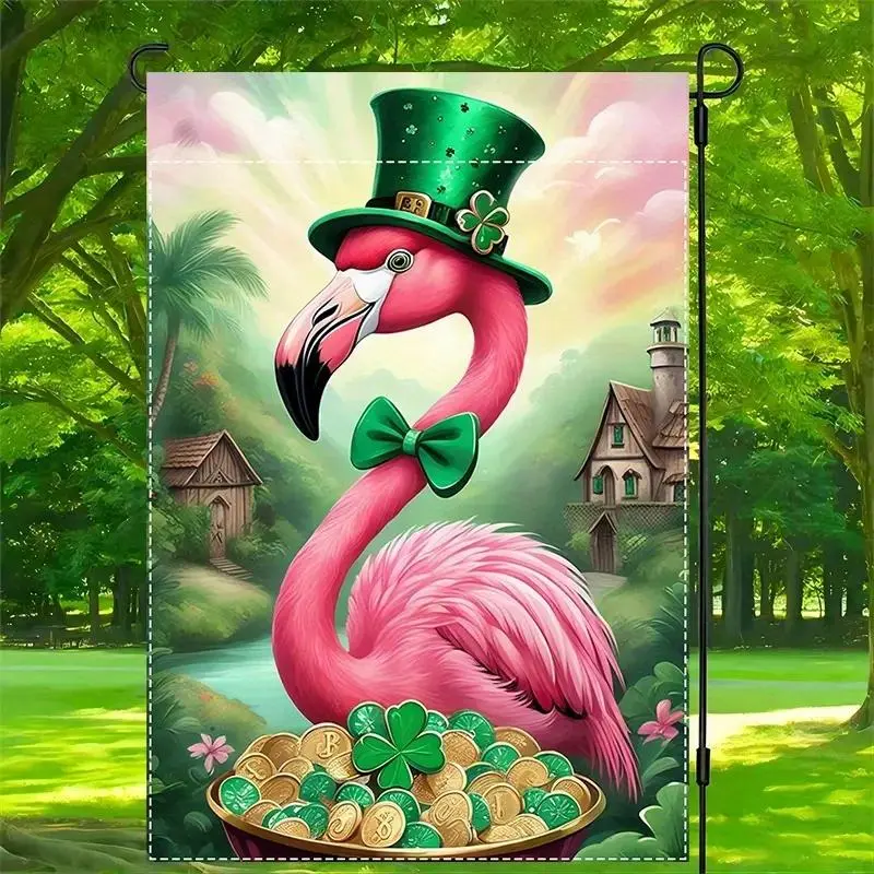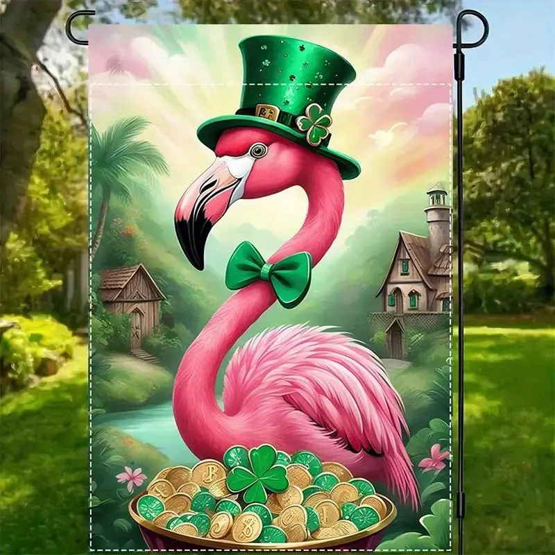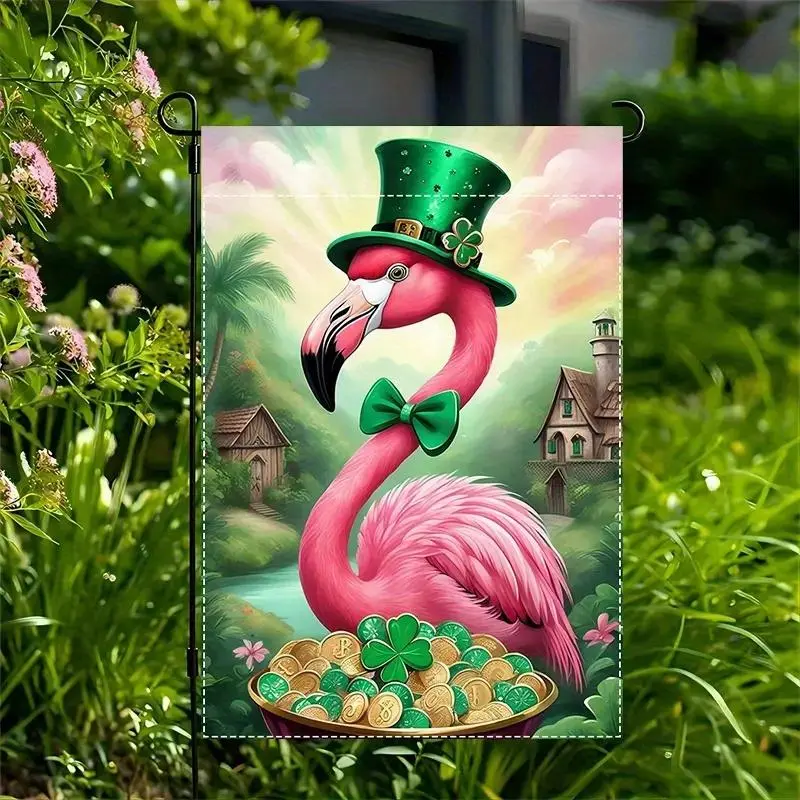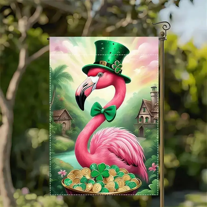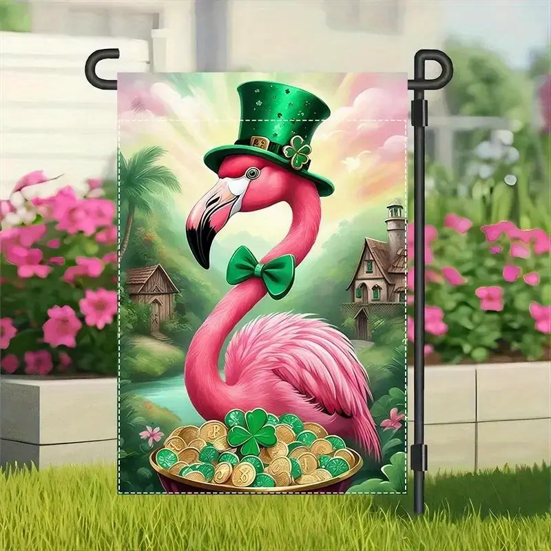 St. Patrick's Day Double Sided Flamingo Welcome Garden Flag 12*18 Inch, Fade Resistant Durable Polyester Outdoor Yard Decor for Porch Lawn, Cute Spring Seasonal Gift for Dog Lover