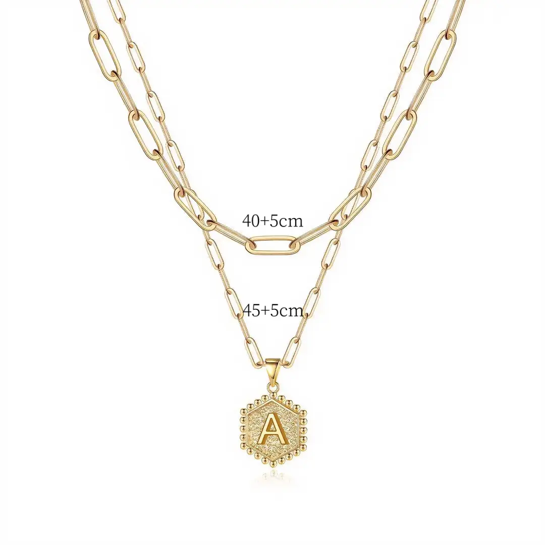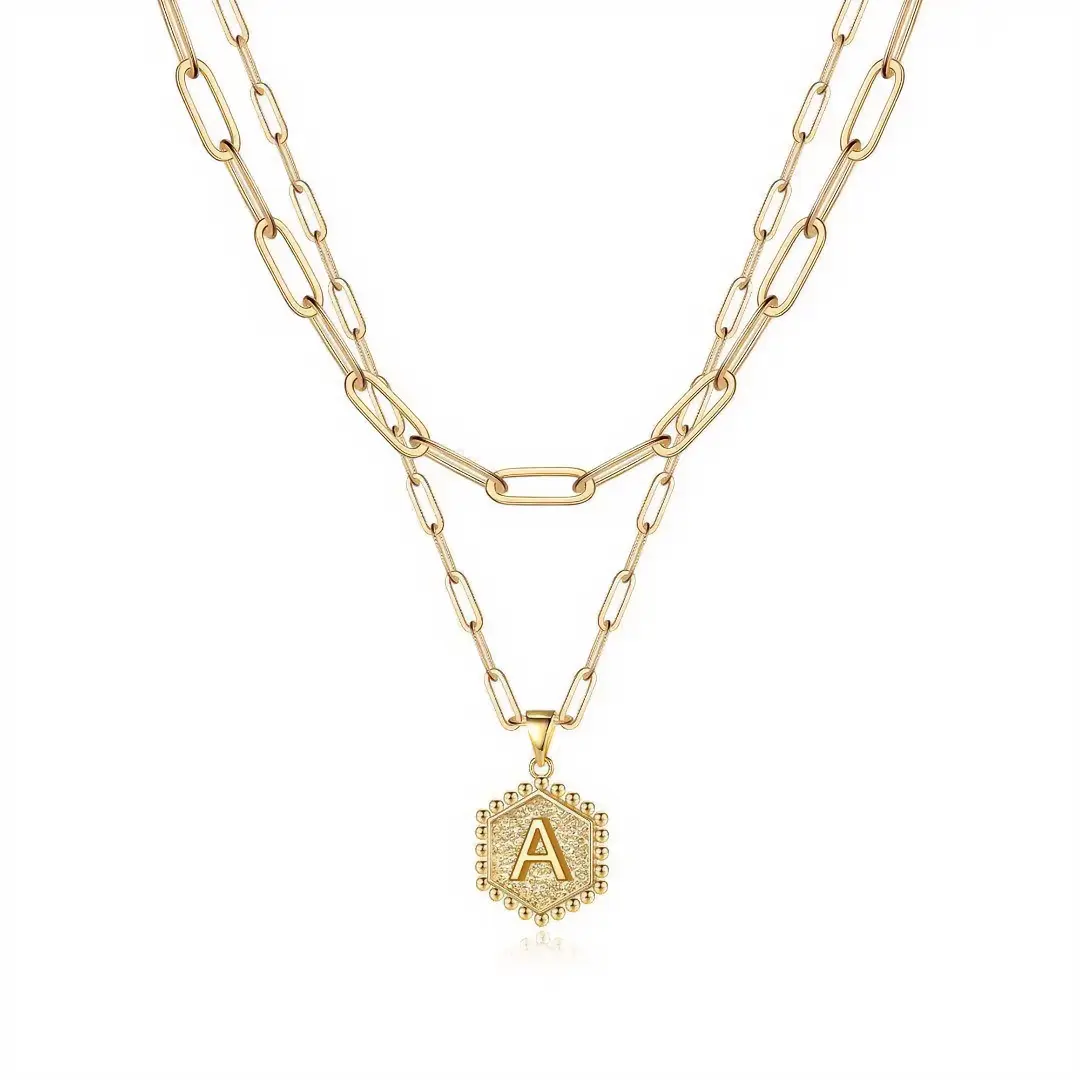 Elevate your everyday style with this18K gold plated initial necklace for women, designed with a modern layered look and a personalized touch.Featuring a bold yet eleganthexagon letter pendant (A–Z)and a trendydouble paperclip chain, this necklace combines minimalism with statement style, making it perfect for both daily wear and special occasions.