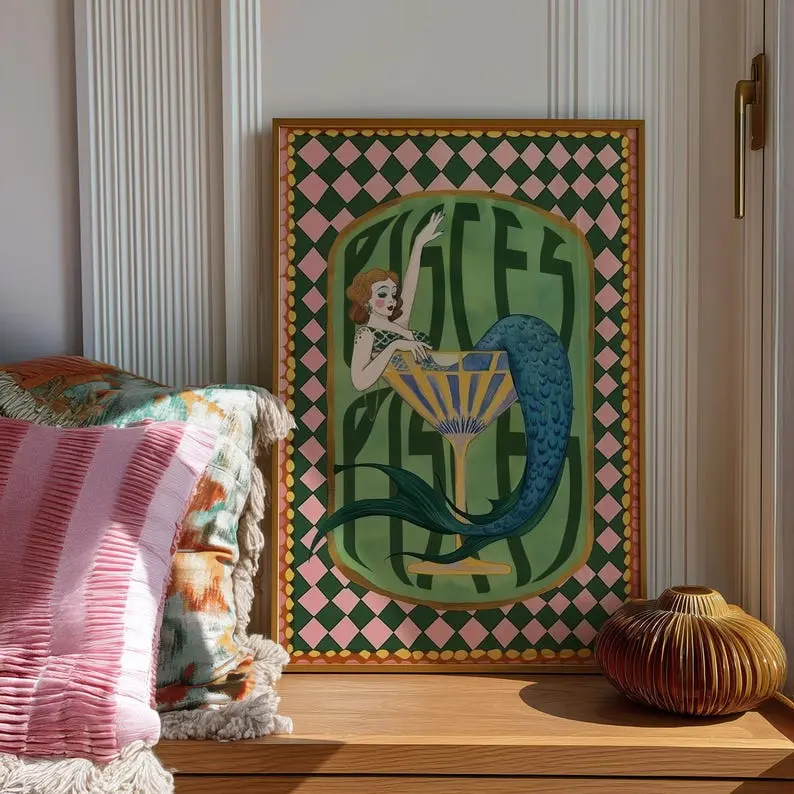 5. [SALE UP TO 50% + FREE SHIP] Pisces Zodiac Art Print Mermaid Cocktail Poster, Astrology Wall Decor, Vintage Horoscope Illustration