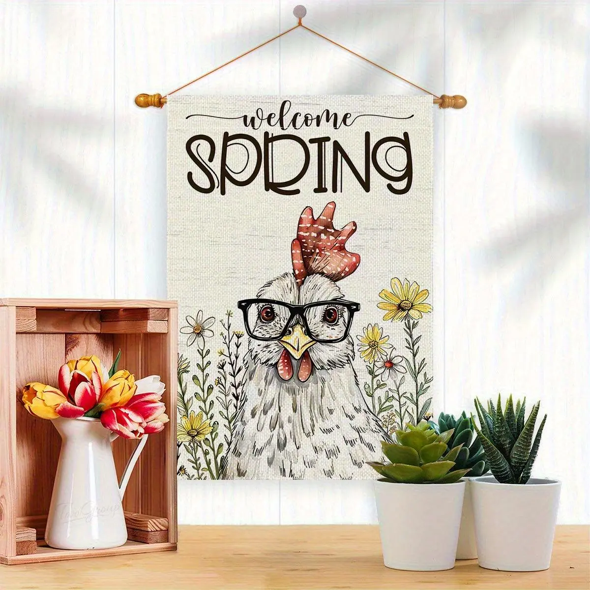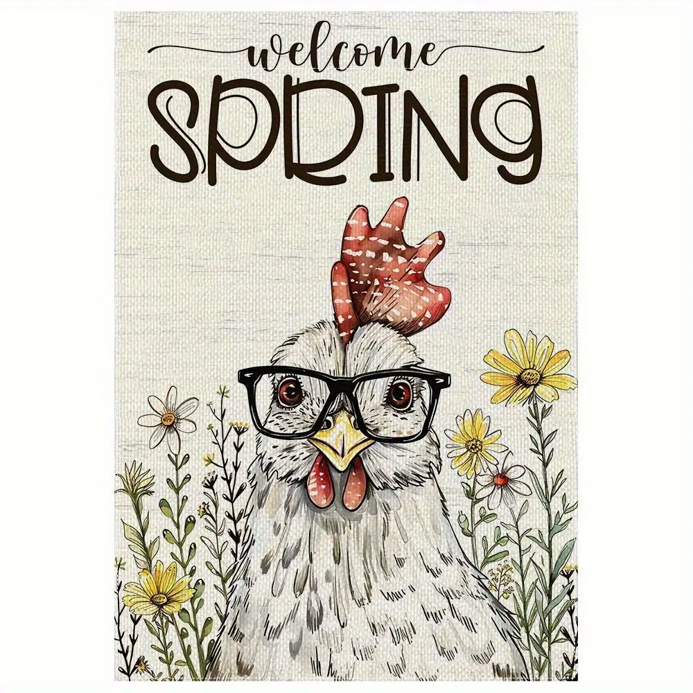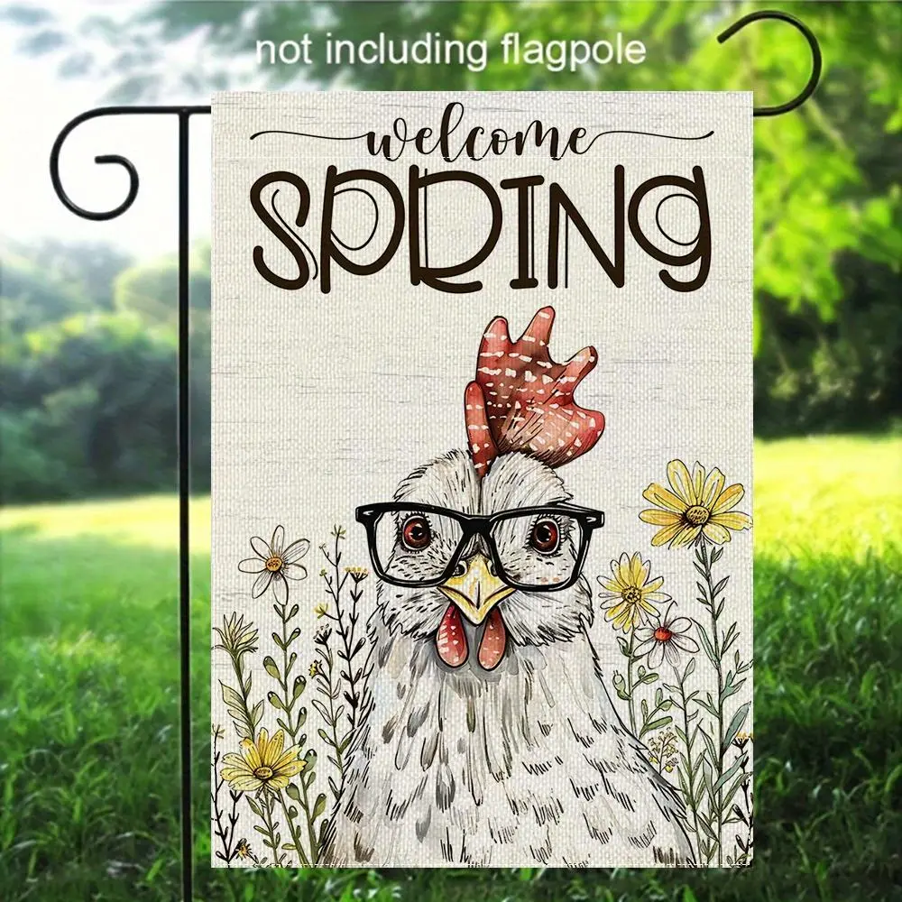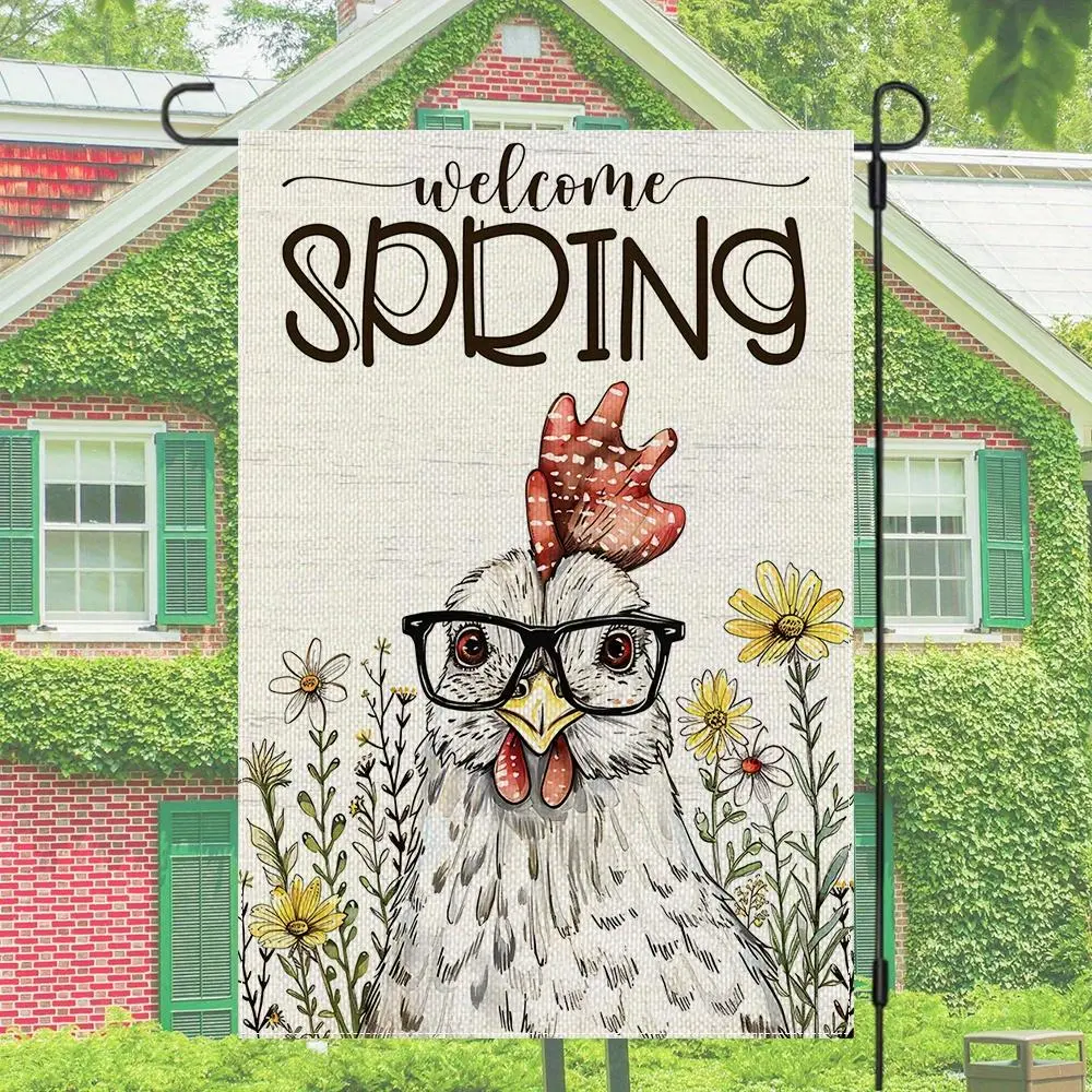 1pc Welcome Spring Chicken Garden Flag 12x18 Inch, Double Sided 2D Flat Design with Glasses & Flowers, Durable Polyester Yard Banner for Outdoor Porch Lawn Decor, Cute Farmhouse Hen for Easter Holiday Gift