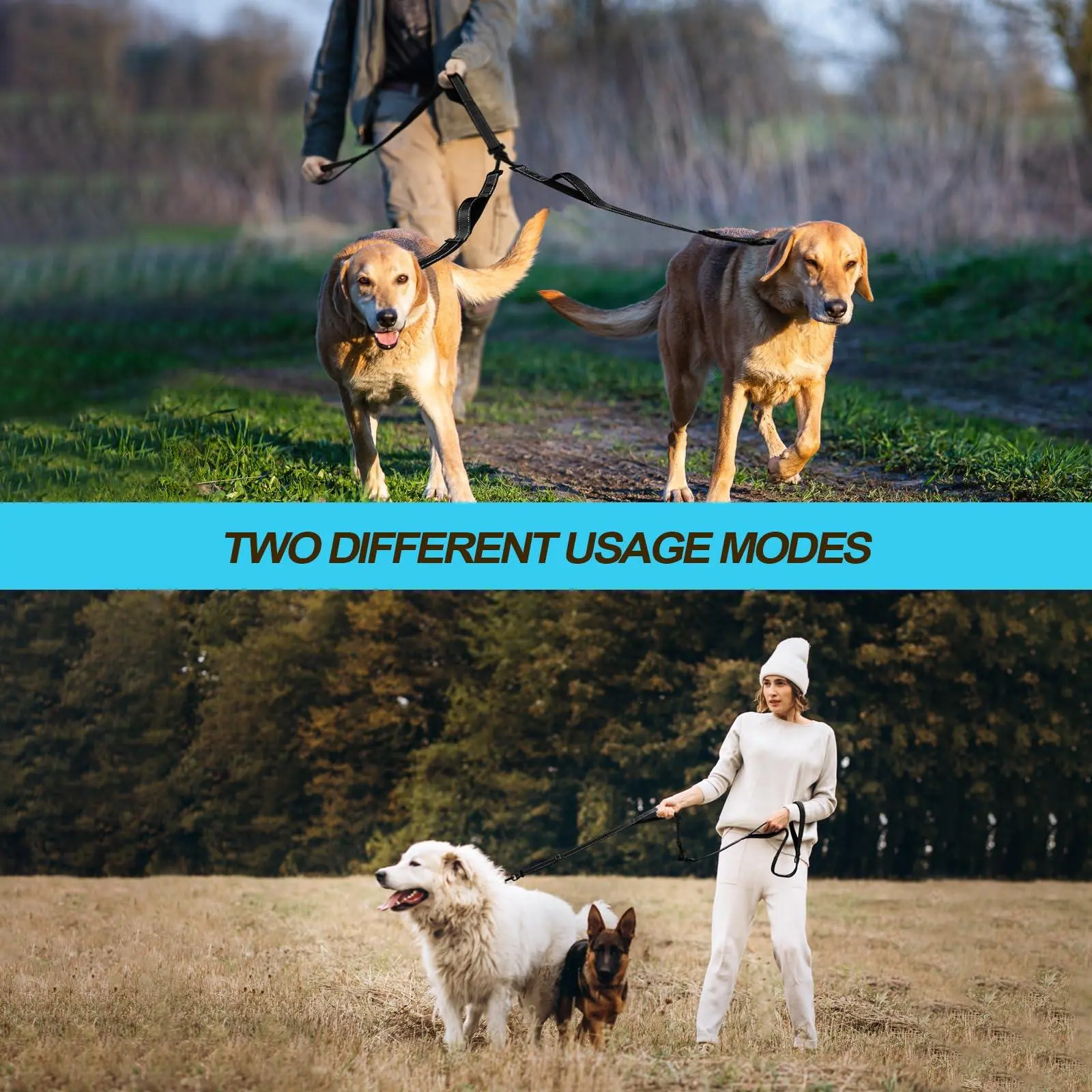 4 Comfortable Padded Handles: No more burned hands with 4 soft padded handles, which bring ultimate comfort and let you free up one hand while using this split leash for walking 2 dogs