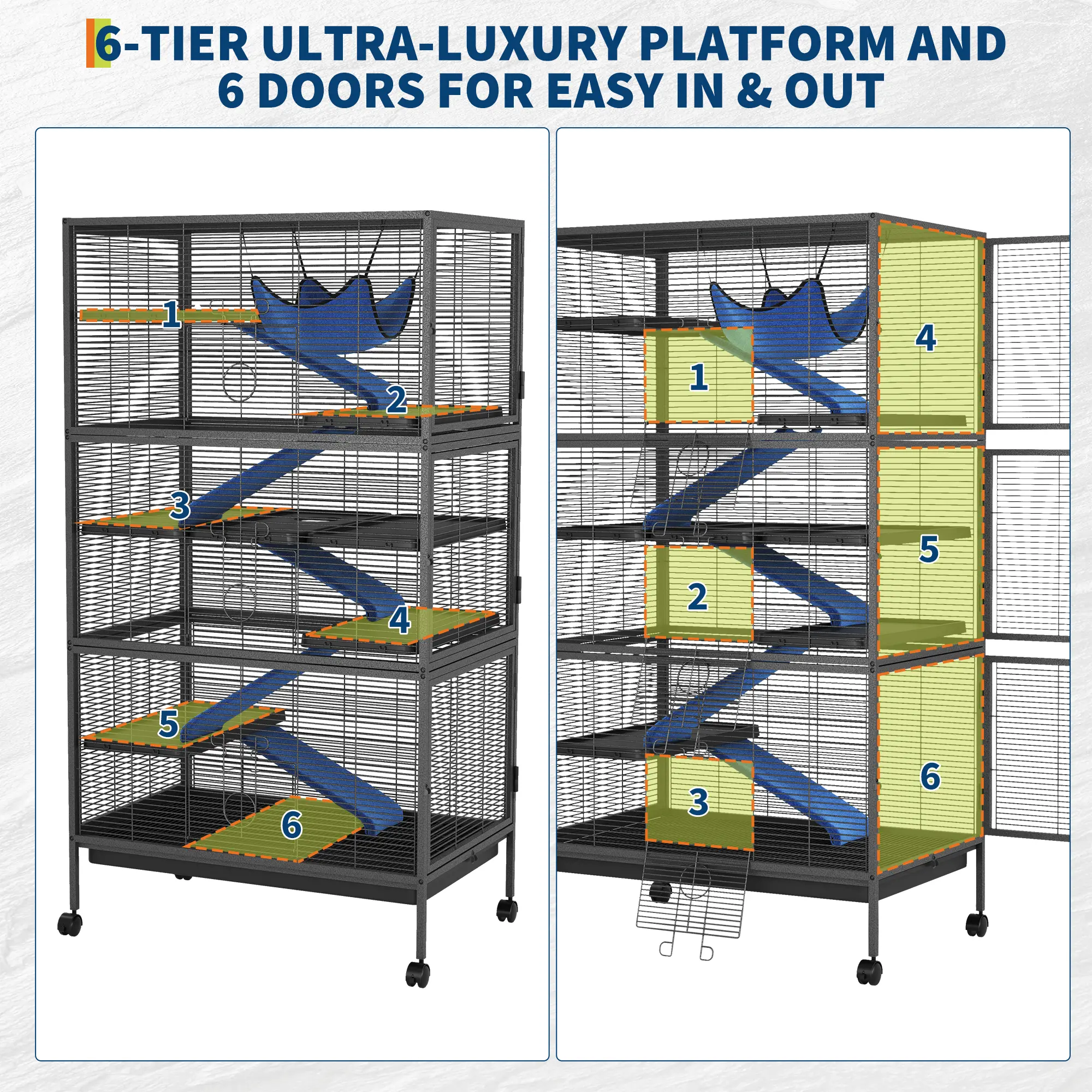 ·Generous Multi-Level Design: Featuring up to 6 tiers with platforms and removable ramps, this habitat provides ample space for climbing, playing, and resting, ensuring pets like ferrets, chinchillas, guinea pigs, and sugar gliders stay active and entertained.