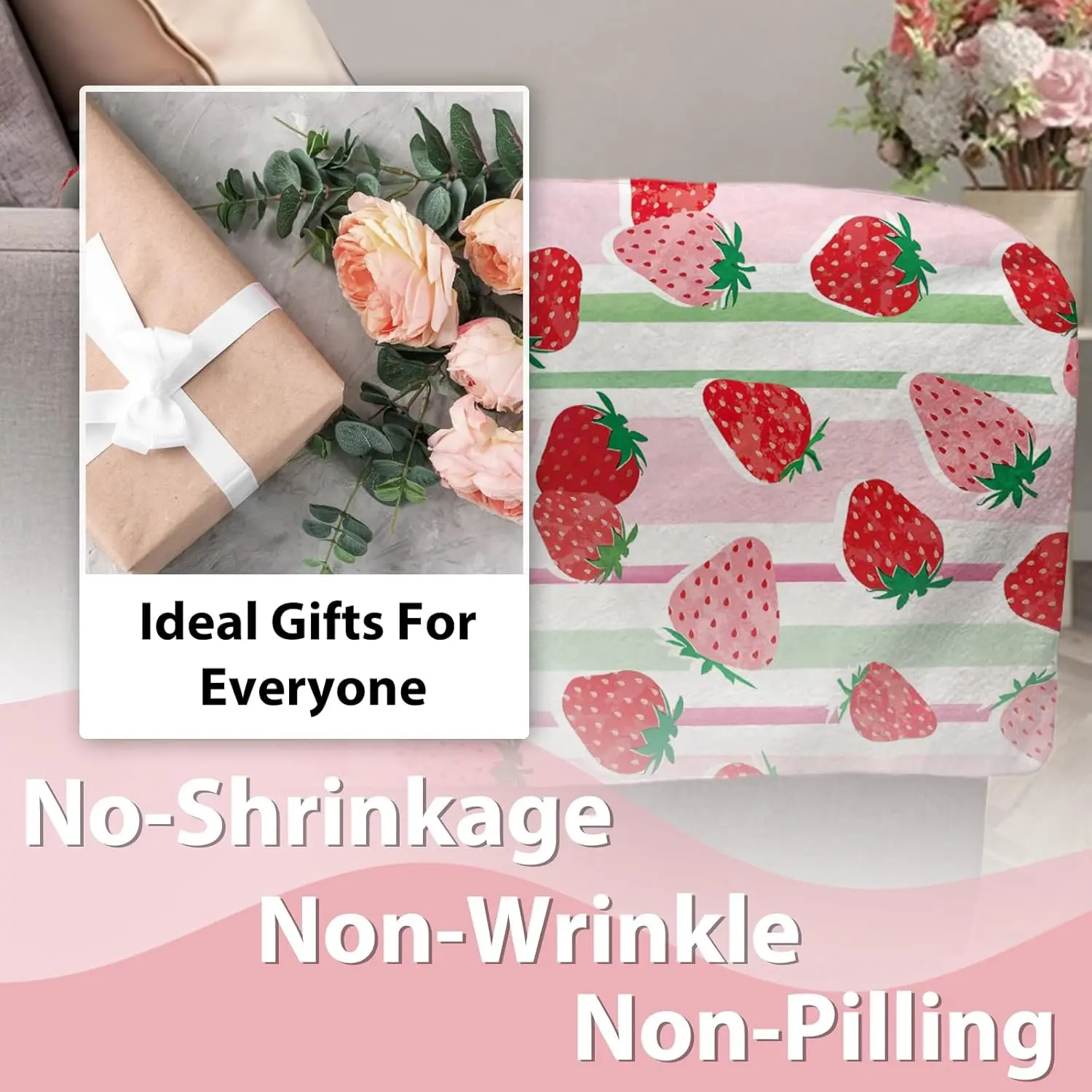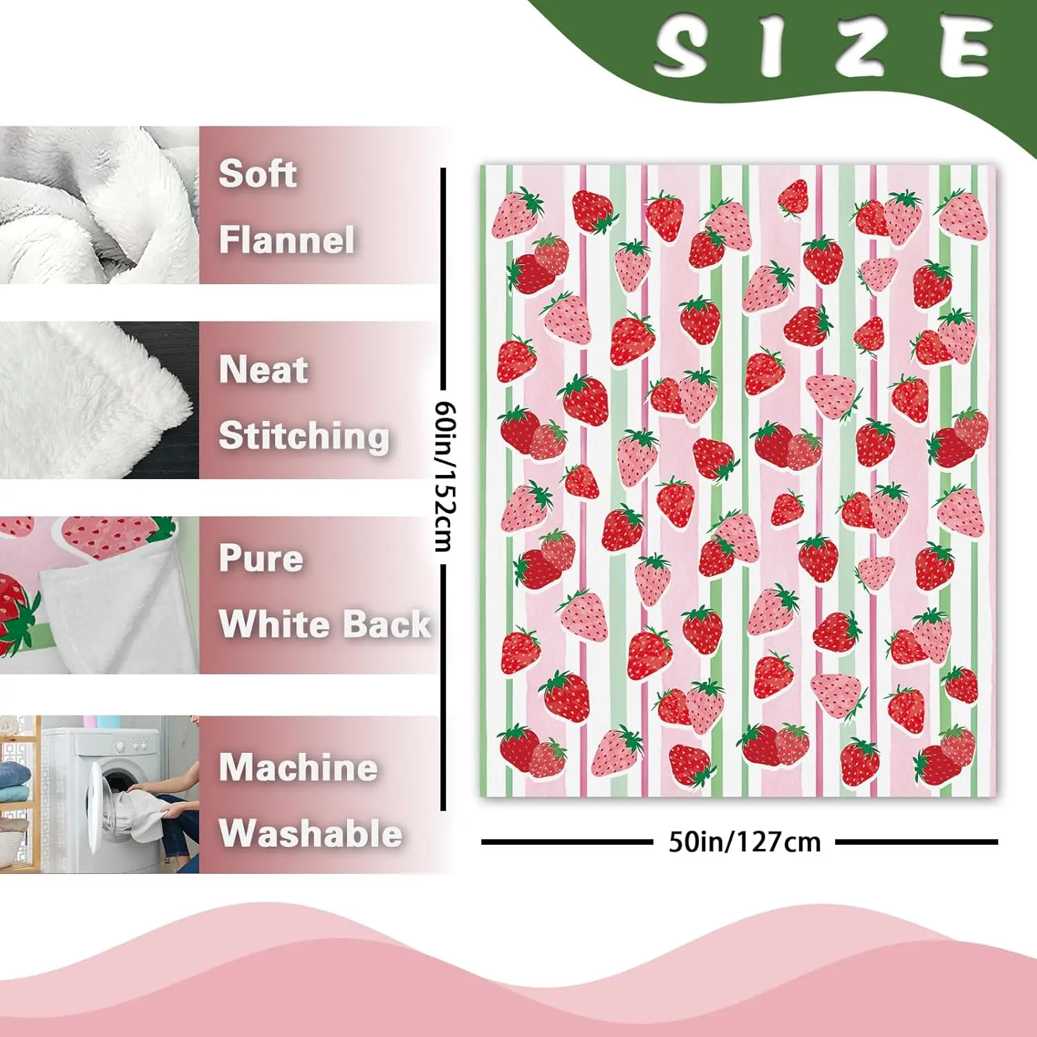 Pink Strawberry Flannel Throw Blanket, Fruit Red Green Stripes Birthday Gifts for Kids Girls Women Adults Teen, Spring Summer Soft Blankets for Bedding Sofa 50" x 60"