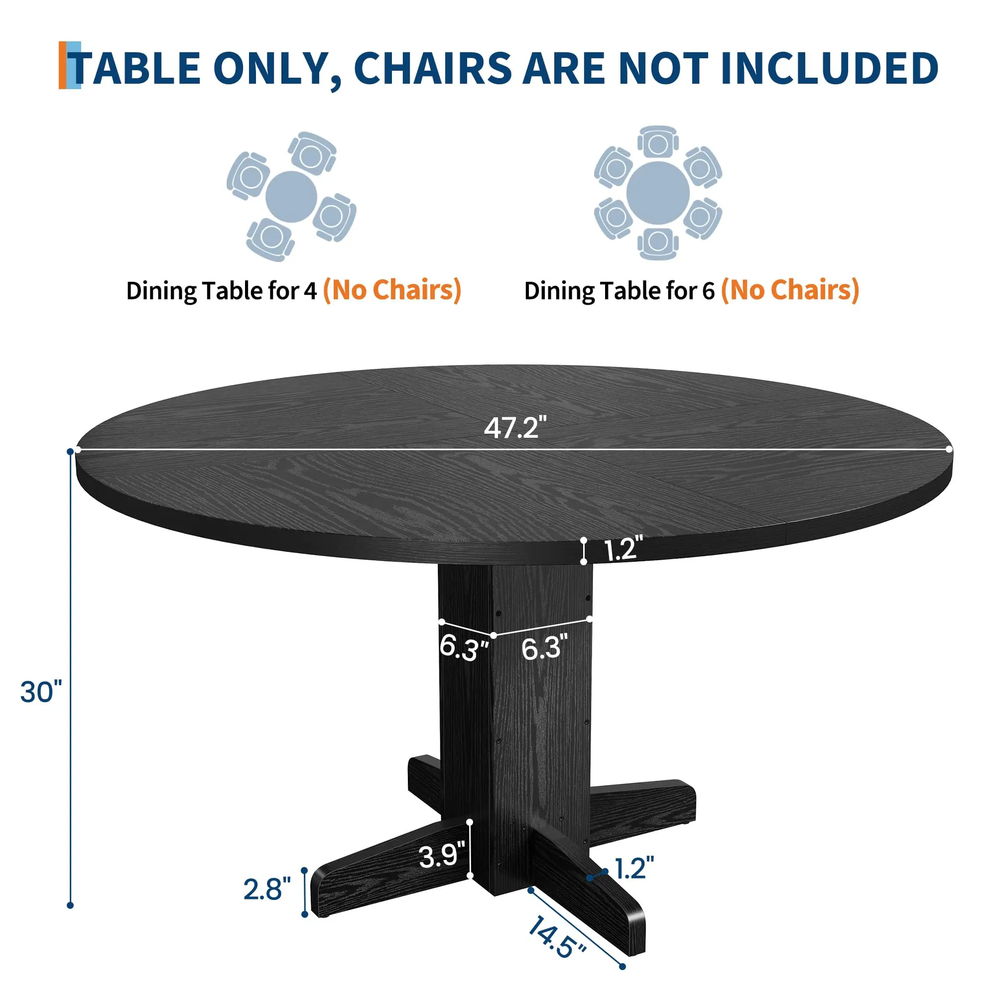 · Spacious 47.2" Round Table for 4–6 People-This 47.2" circular dining table offers ample surface space to seat 4–6 guests comfortably—ideal for family dinners, casual gatherings, or daily meals. The sleek black oak finish adds modern warmth to kitchen/dining room decor (chairs not included).