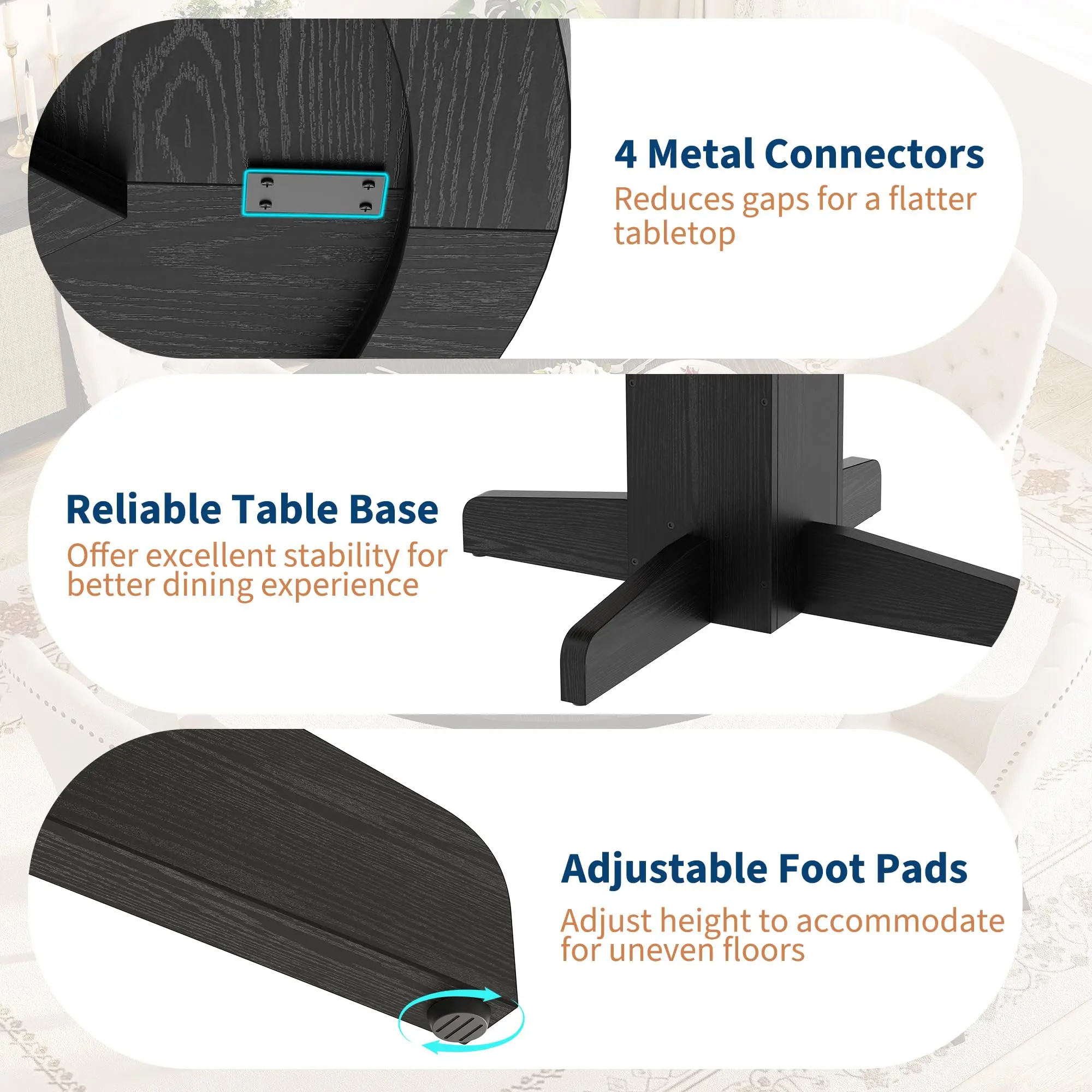 · Adjustable Foot Pads for Uneven Floors-Equipped with adjustable foot pads, this round dining table easily adapts to uneven surfaces (tile, hardwood, or carpet). Simply tweak the pads to level the table, ensuring a stable dining experience in any space.