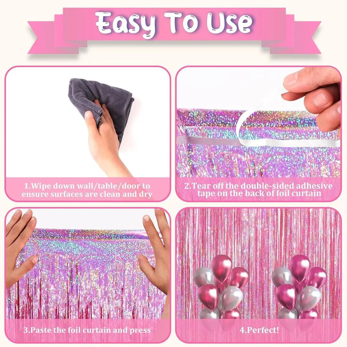 How to Set up: Wipe down wall/table/door, ensure surfaces are clean and dry, tear off the double-sided adhesive tape, paste the foil backdrop curtains and press. Hang each individual tinsel fringe curtains in different locations for a fuller effect.