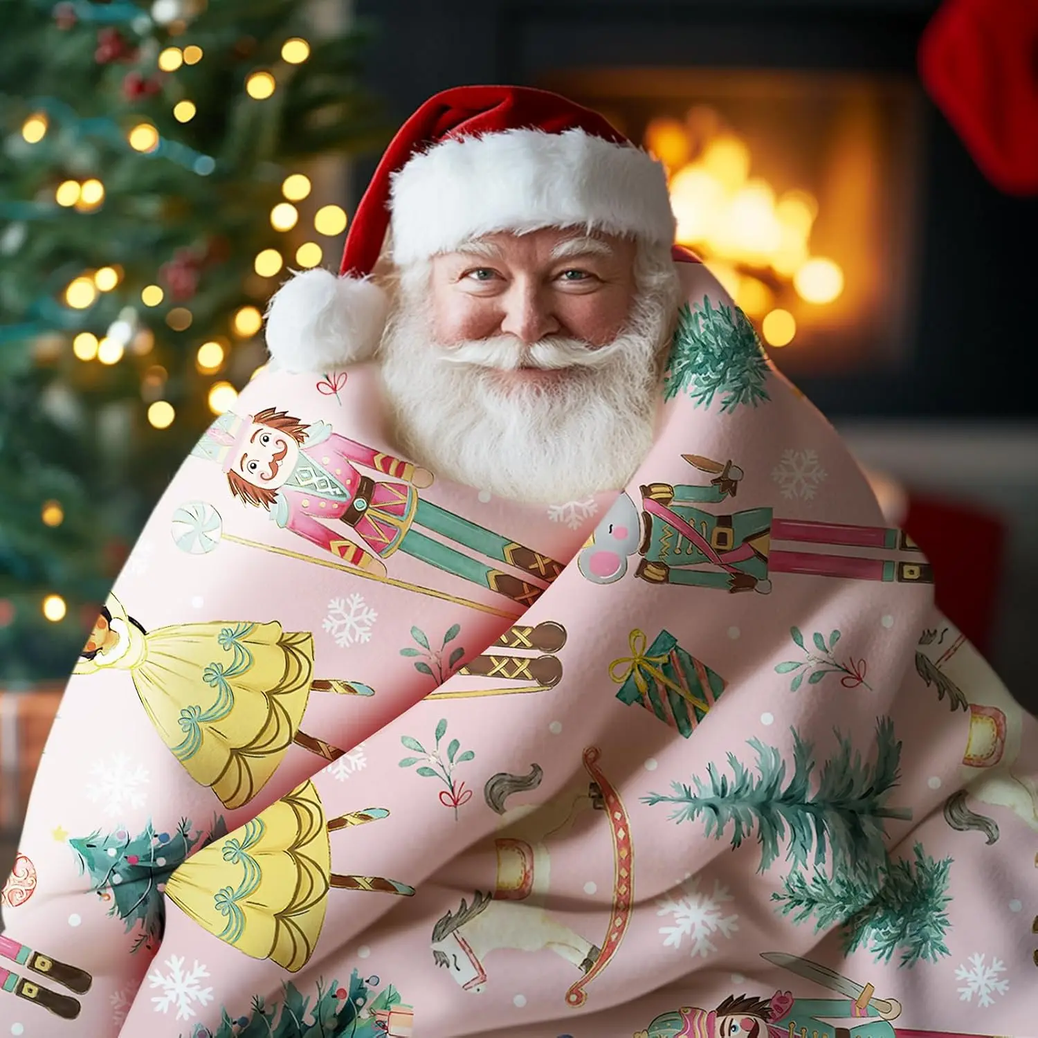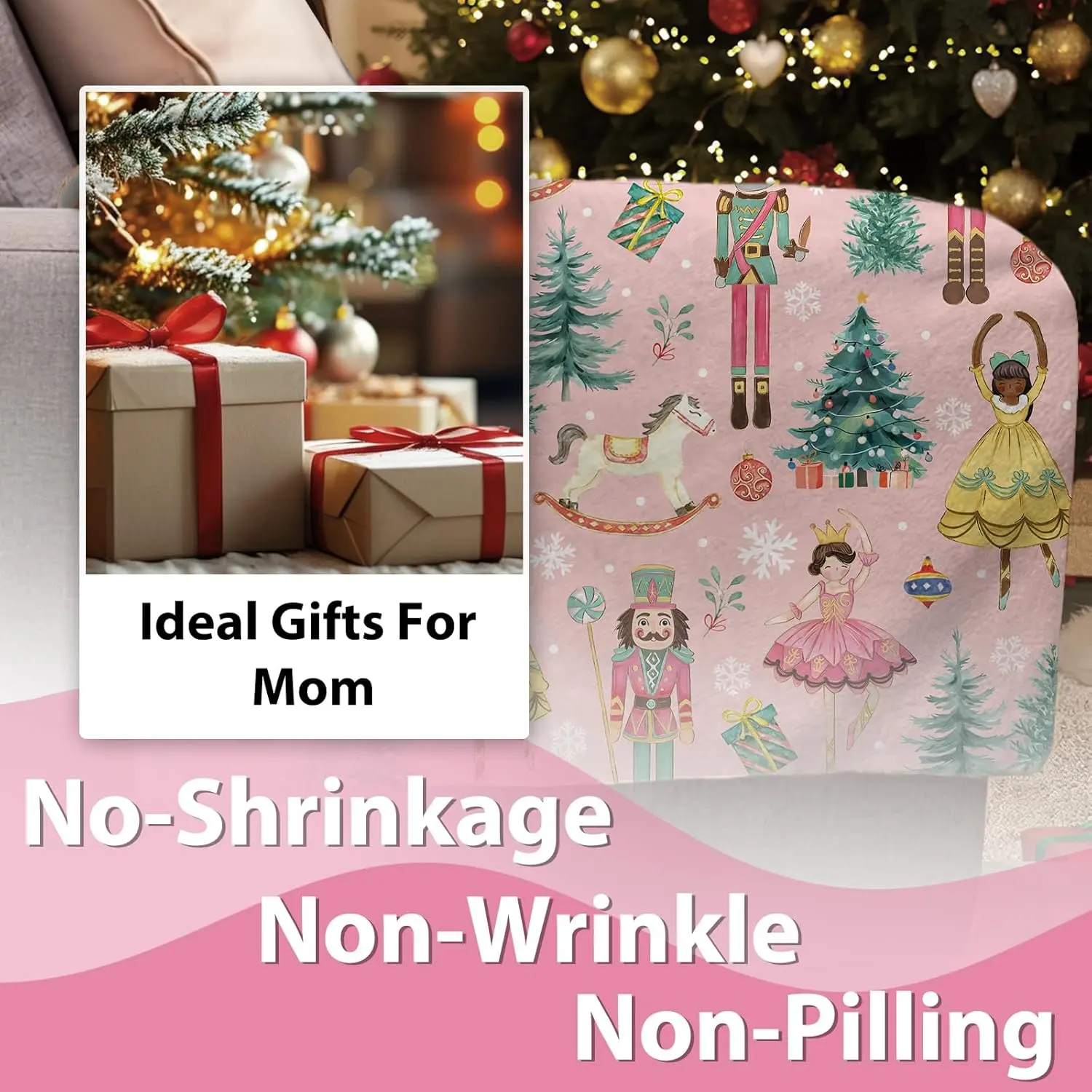 Pink Christmas Nutcracker Flannel Throw Blanket, Cute Xmas Tree Wooden Horses Balls Birthday Gifts for Kids Men Women, Winter Holiday Snowflake Soft Blankets for Bedding Sofa 50 x 60 Inches