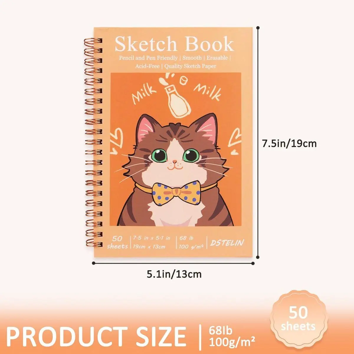 2-Pack DSTELIN Mini Sketchbooks with Tabby Cat Art : Spiral-bound, landscape-oriented (7.5 x 5.1 in / 19 x 13 cm) with warm orange hardcovers, each featuring an adorable hand-drawn tabby cat illustration with a bow tie for a whimsical and cute touch.