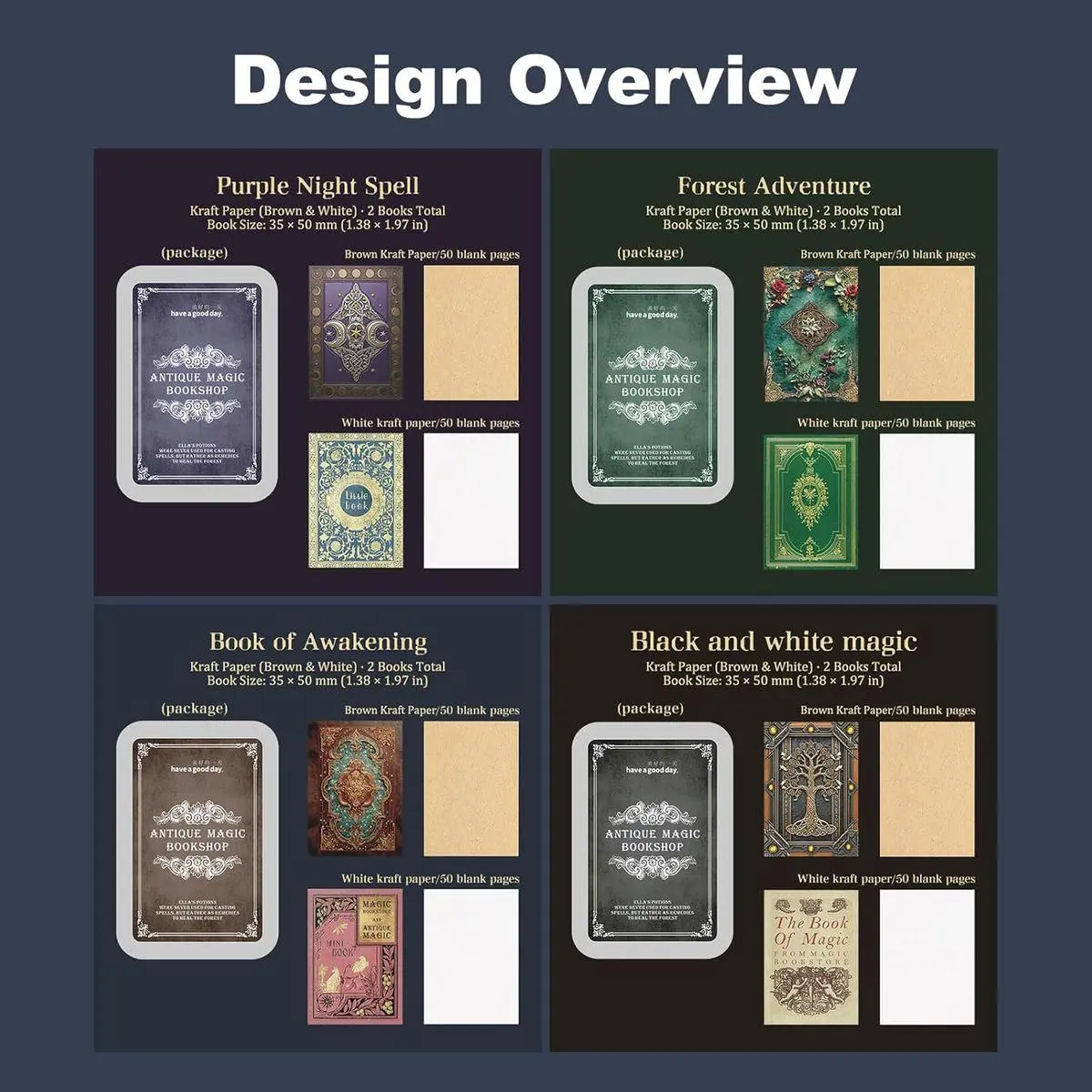 Design & Theme: Antique magic book inspired mini journals in four coordinated fantasy styles featuring vintage covers and mystical motifs that add storytelling depth and visual character to scrapbook and journal layouts