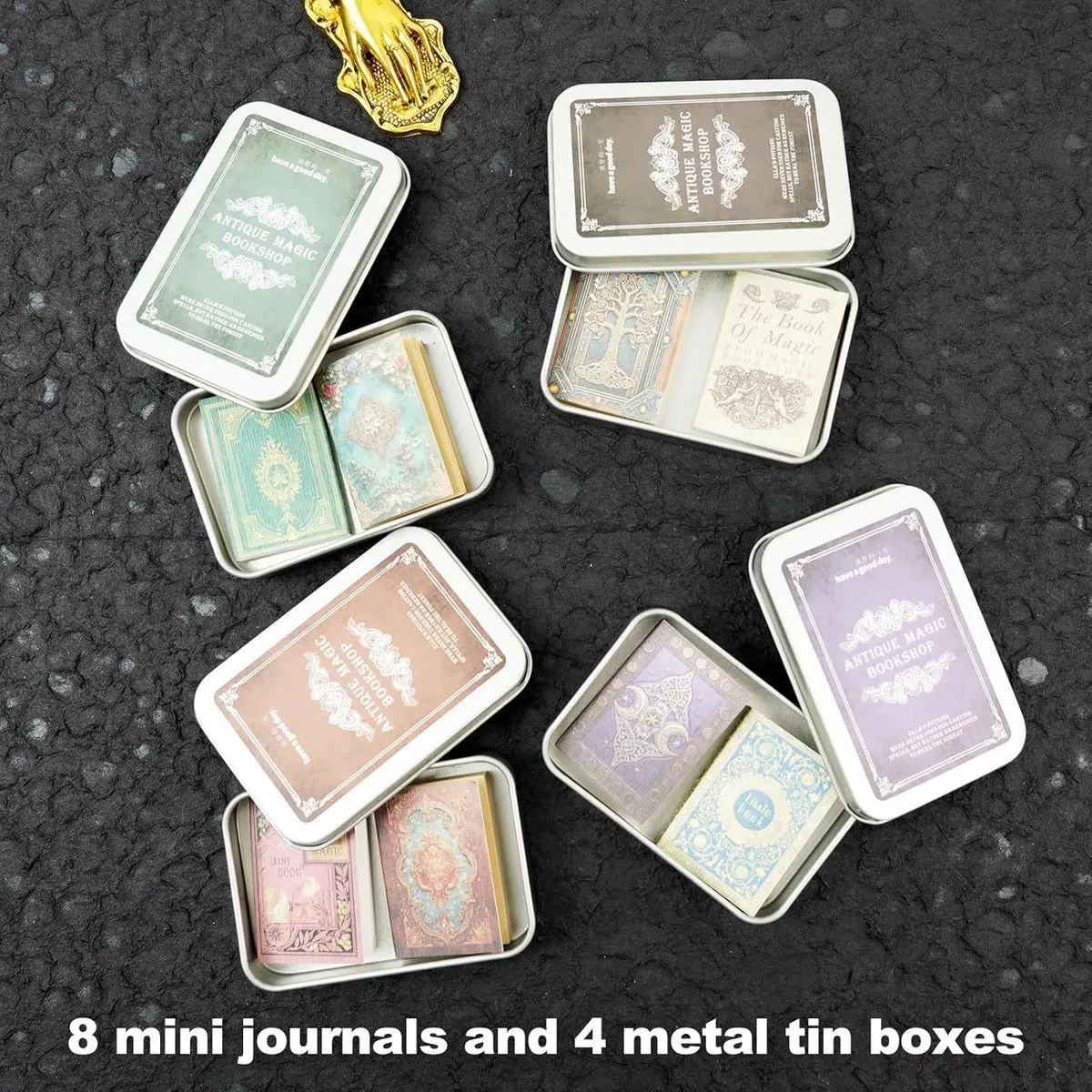 Quantity & Set Structure: Includes eight pocket size journals and four reusable metal tin boxes with each design containing two separate books one with brown kraft paper pages and one with white kraft paper pages