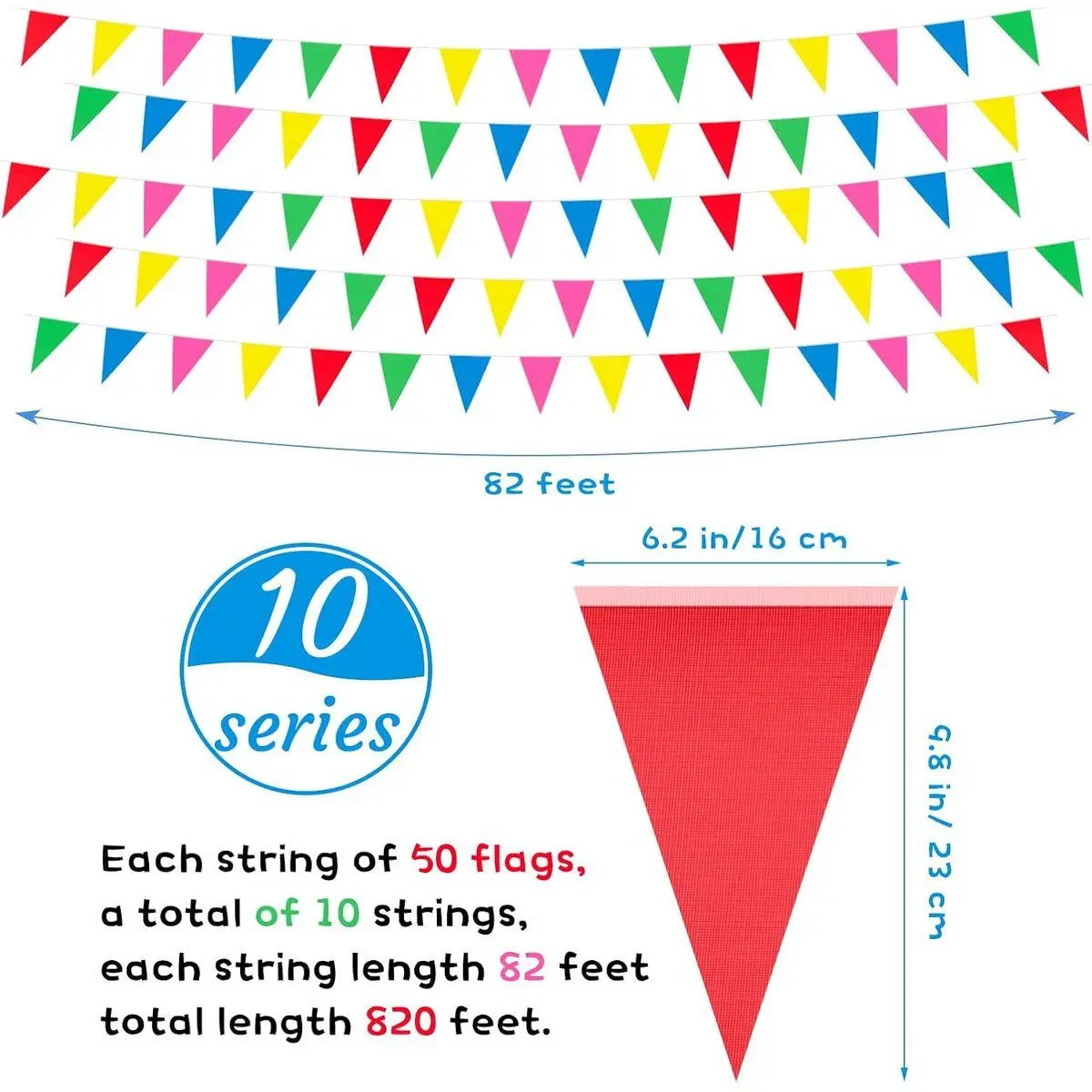 What You Will Get: you will receive 500 pennants flags, 50 flags per banner, a total of 10 pieces, each is 82 feet, a total length of 820 feet; Single flag is 6.2 x 9.8 inch/ 16 x 23 cm (W x L), total banner length is 250 meters/ 820 feet; This banner is eye-catching, suitable for any occasion such as carnival circus, birthday party, Christmas or grand opening, etc