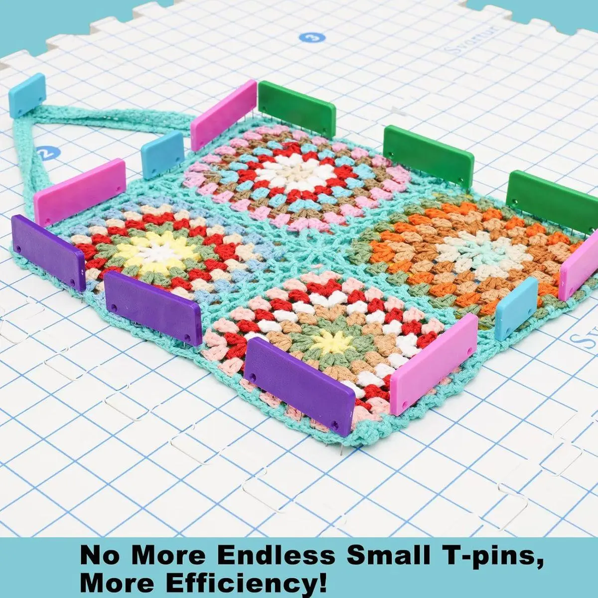 【Versatile Set】: Each package of crochet blocking pins set includes 20 blockers, featuring 12 large blockers with 8 rust-resistant stainless steel pins and 8 small blockers with 4 pins, catering to various project sizes. Also, come with a soft ruler, and 100 T-pins for larger knitting project purposes.