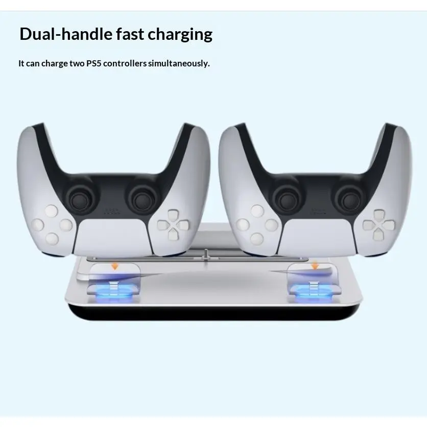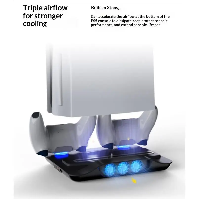 🎮Basic support for multi-function cooling fan for PS5, PS5 Slim and PS5 Pro.Game controller included with blue lighting and charging station.Perfect for game accessories with battery protection function.Ideal for optimal cooling and loading operations.